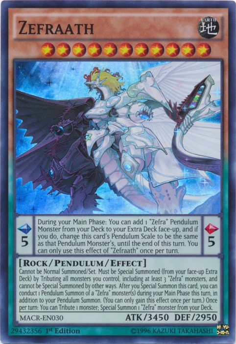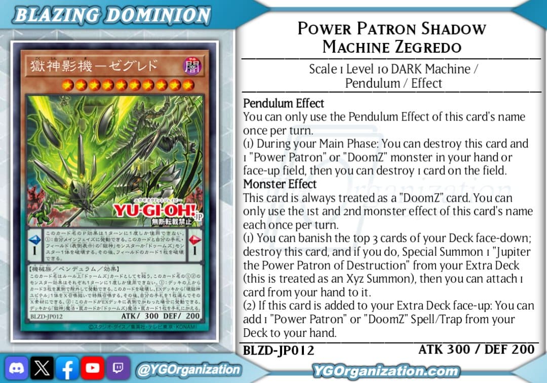 Zegred, Power Patron of Shadow MachinesDARK Level 10 Machine Pendulum Effect Monster300 ATK / 200 DEF | Scales: 1/1-PENDULUM TEXT -You can only use the Pendulum Effect of this card's name once per turn.(1) During your Main Phase: You can destroy this card and 1 "Power Patron" or "Doom-Z" monster from your hand or face-up field, then you can destroy 1 card on the field.-MONSTER TEXT-(This is always treated as an "Doom-Z" card.)You can only use the following monster effects, (1) & (2), from this card's name once per turn.(1) You can banish face-down the 3 topmost cards from your Deck; destroy this card, and if you do, Special Summon 1 "Jupiter, Power Patron of Destruction" from your Extra Deck (this is treated as an Xyz Summon), then you can attach 1 card from your hand to it as material. -Ignition.-(2) If this card is added to the Extra Deck face-up: You can Special Summon 1 "Power Patron" or "Doom-Z" Spell/Trap from your Deck or face-up Extra Deck, except "Nerved, Power Patron of Shadow Beasts". -Trigger.-