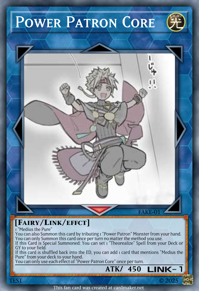 >>552827937Each of the effects 1 and 2 of this card's name can only be used once per turn. 1: Send 1 "Power Patron" monster from your Deck or Extra Deck to the Graveyard. Then, you can add 1 DARK Fairy monster from your Deck to your hand. This turn, you can only declare attacks with "Power Patron" monsters. 2: At the start of the Damage Step when your "Power Patron" monster battles an opponent's monster, you can activate this effect by banishing this card from your GY. Banish that opponent's monster face down.