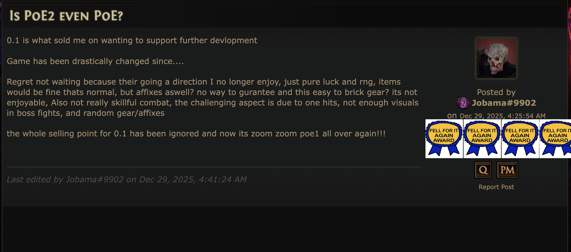 >>552932915>PoE1 has been dogshit for years.Because of PoE2 development that sucked all the resource from PoE1.>11 months league>low effort leagues>nerfs and nerfs to 'align' PoE1 with PoE2 in Expedition, Kalandra>more nerfs to loot so people don't get dopamine burn-out for the upcoming Poo2 leagueDogshit all the way.