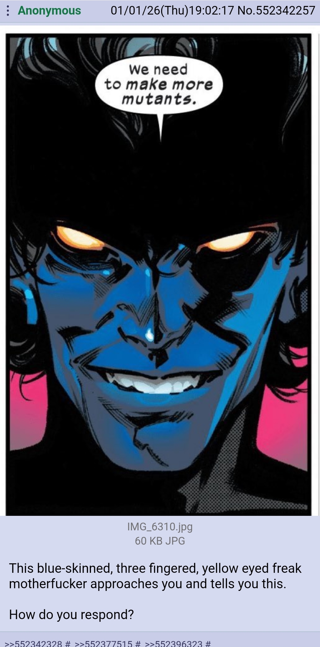 >>552897718Never understood why they made Nightcrawler religious, I get it's supposed to be ironic but mutants are literally the next step in evolution, his whole existence would be considered blasphemy to christfags