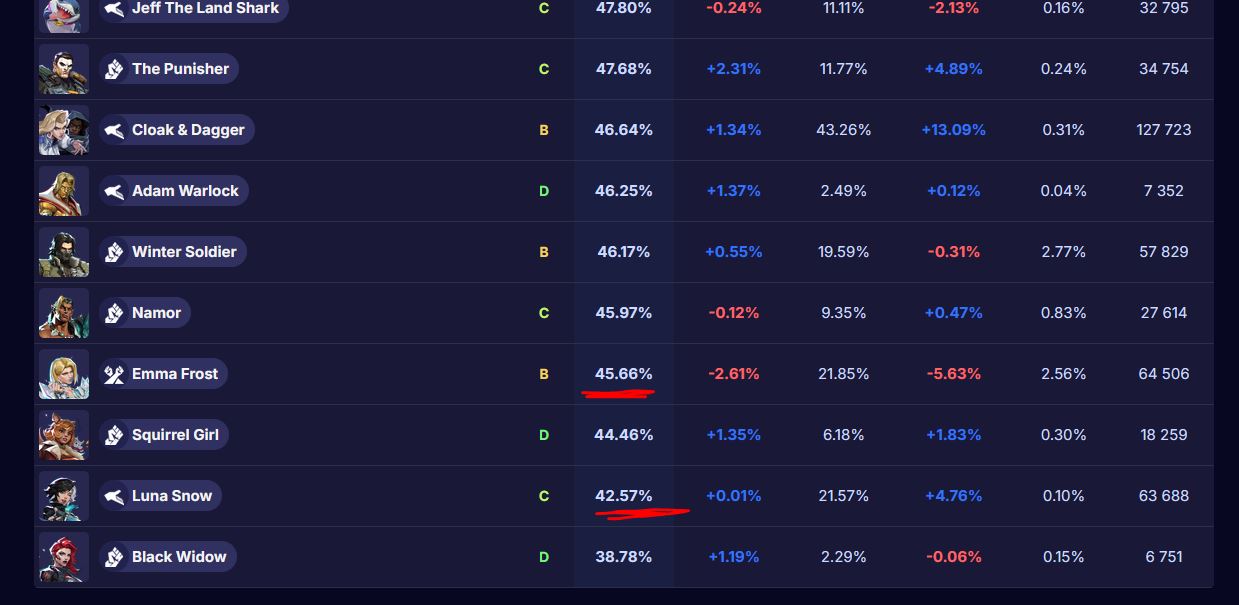The worst tank in the game right now has to be Peni. I'm not a very good shot, I probably miss 3 out of 5, and when I'm playing Jean or Hela or Punisher or Iron Man or even Magneto I see her and it's just free kills. Easy to hit, durable as tissue paper, doesn't really do anything. I see her putting webs down and I honestly have no idea what they do, if they do anything it's so minor I don't notice. This is multiple games, multiple maps. Just an awful character.