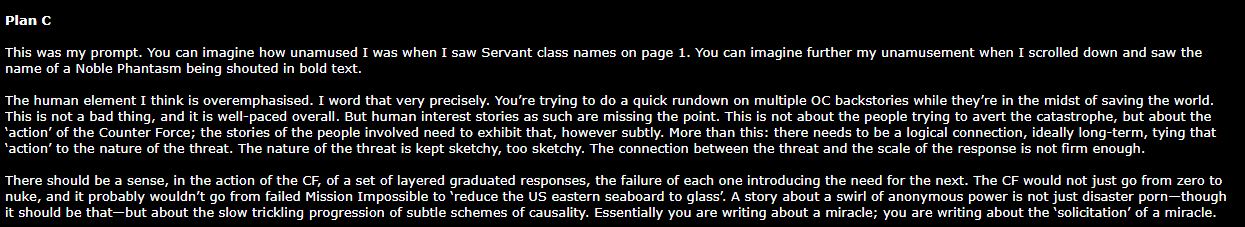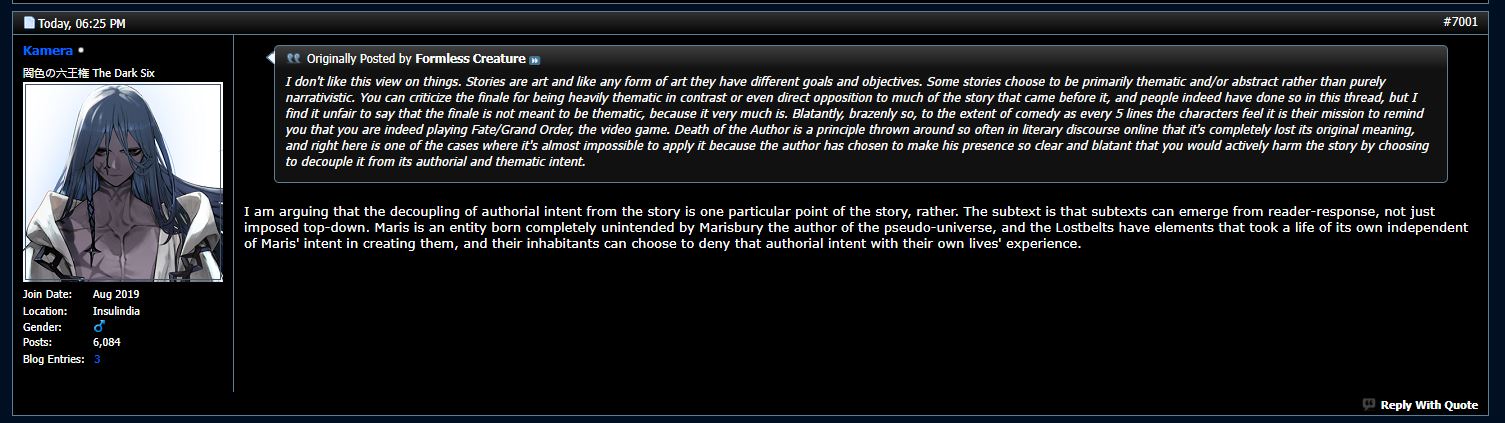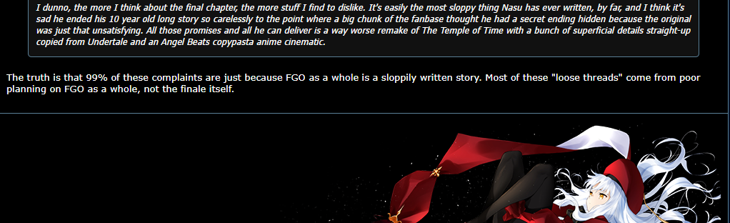 man, that ending sucked so fucking much. worthless, empty, meaningless, at best it's a pastiche of better works and nasu wanting to be done with fgo asap, at worst nasu has dementia.