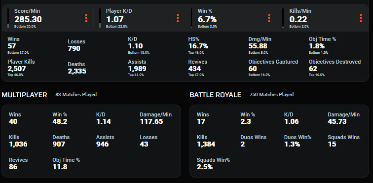 >>553372012cool, I played infantry only for 80% of my battlefield playtime and I have better stats than you.vehicles are absolute dogshit in 6, how dogshit do you have to be to cry about them? LOL
