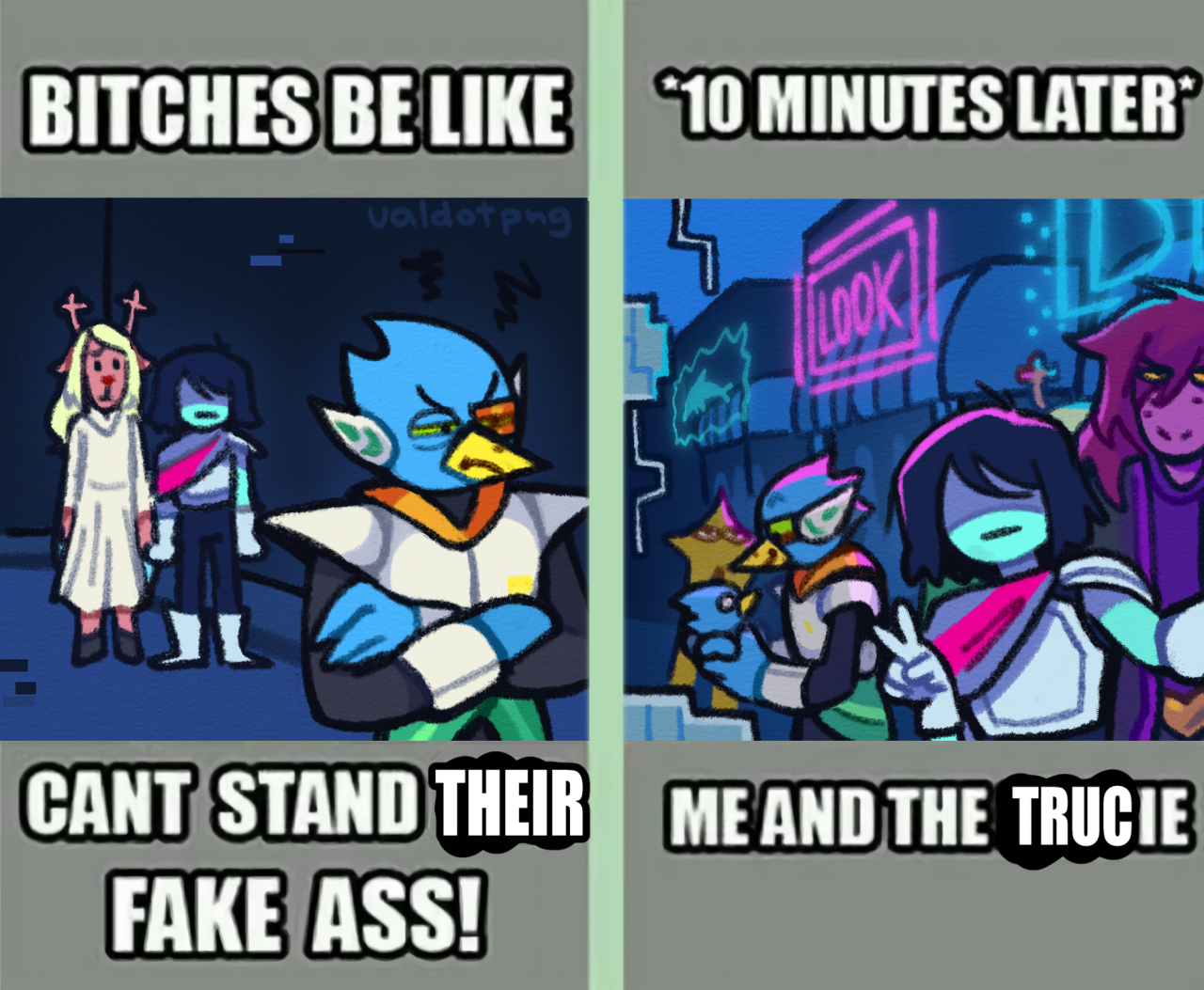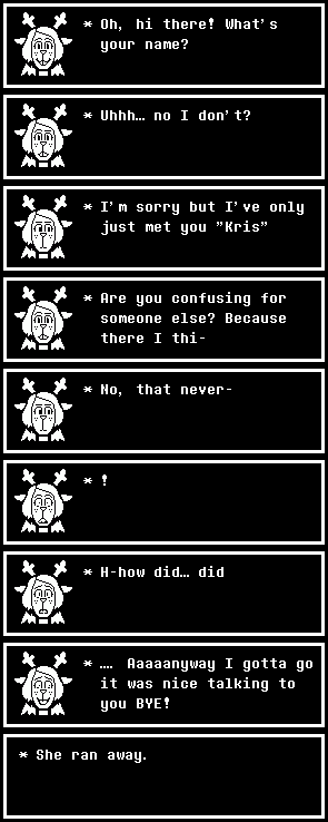 >ch7>weird route>Kris walks up to last fountain solo>Susie is there>she's pisaed over everything you've done>goes on a rant about how much of a piece of shit you are>"tldr">"eat shit faggot">battle starts>Megalovania (2008) starts playing