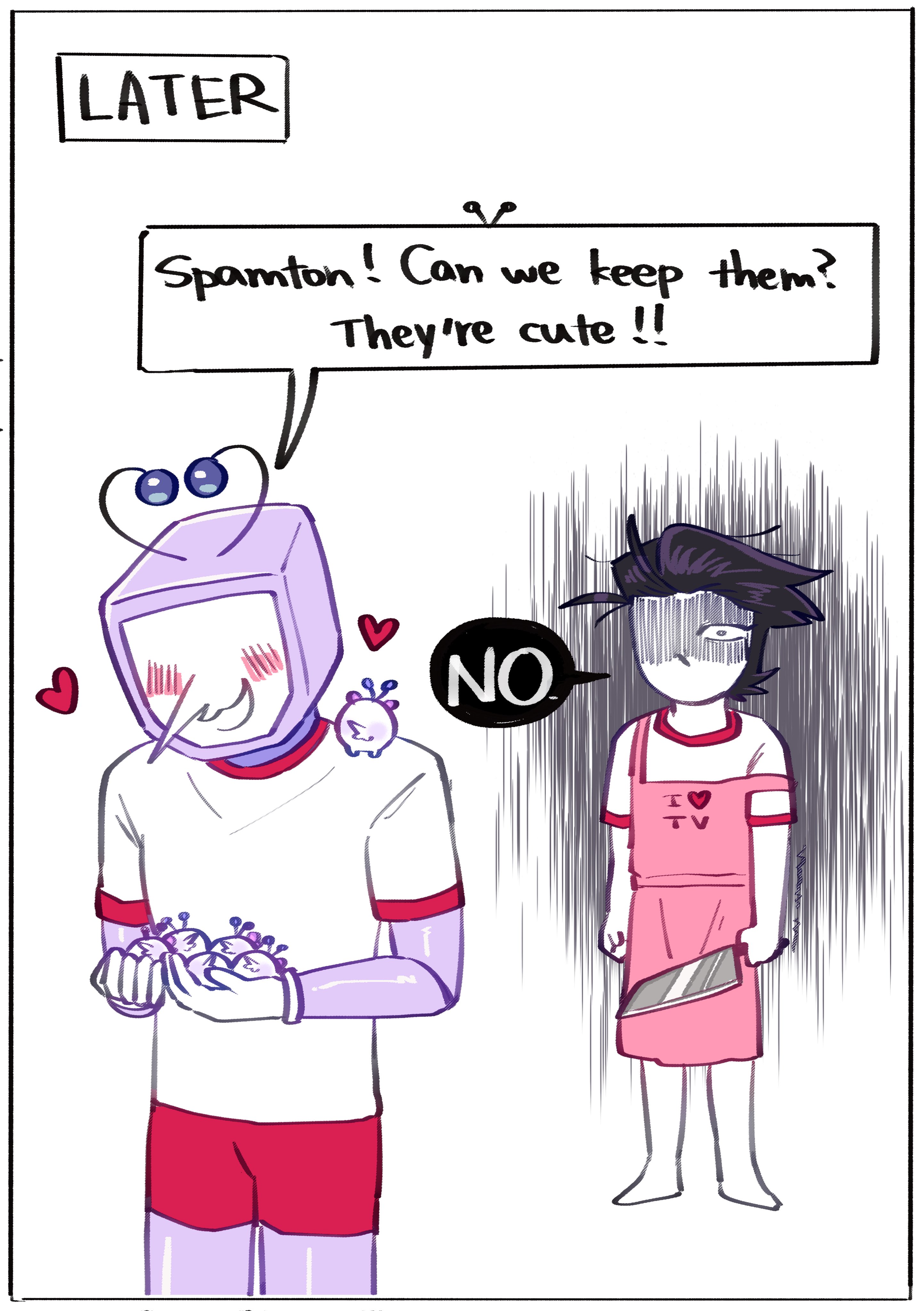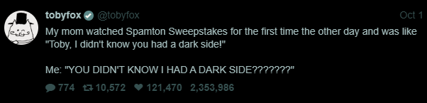 Toby's mom watched Spamton Sweepstakes for the first time in September and was like "Toby, I didn't know you had a dark side!"Toby responded: "YOU DIDN'T KNOW I HAD A DARK SIDE???????"
