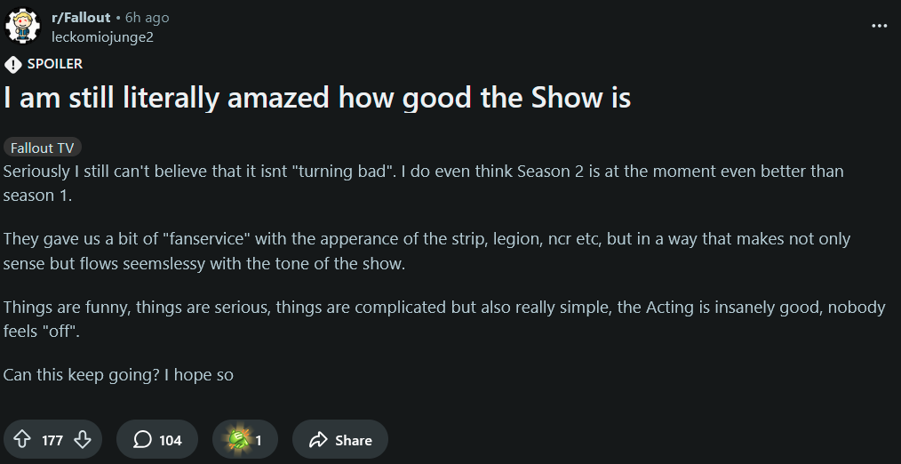 So who are the winners with the show? NV fags? Fallout 4 cucks? 76 trannies? I feel like this blatant rip off of Star Wars' visuals is just a win for The LGBTQ community and its allies.