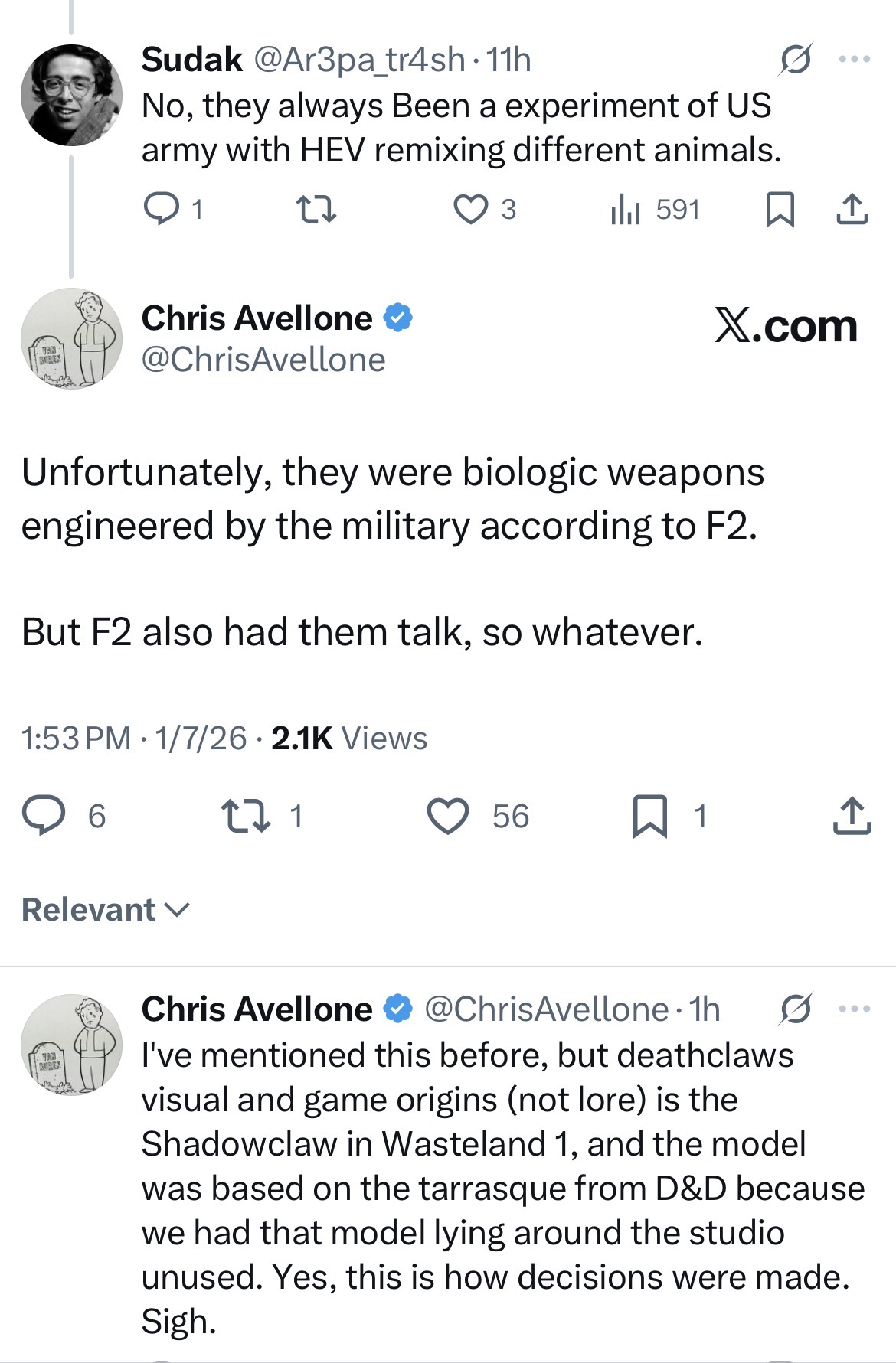 >>553075246>>553075649I kinda assumed that Deathclaws were still being refined by the military before the bombs dropped and afterwards they escaped whatever lab they were being made in and got mutated by radiation + FEV. I guess in the new lore they were already finished and being deployed in 2066.