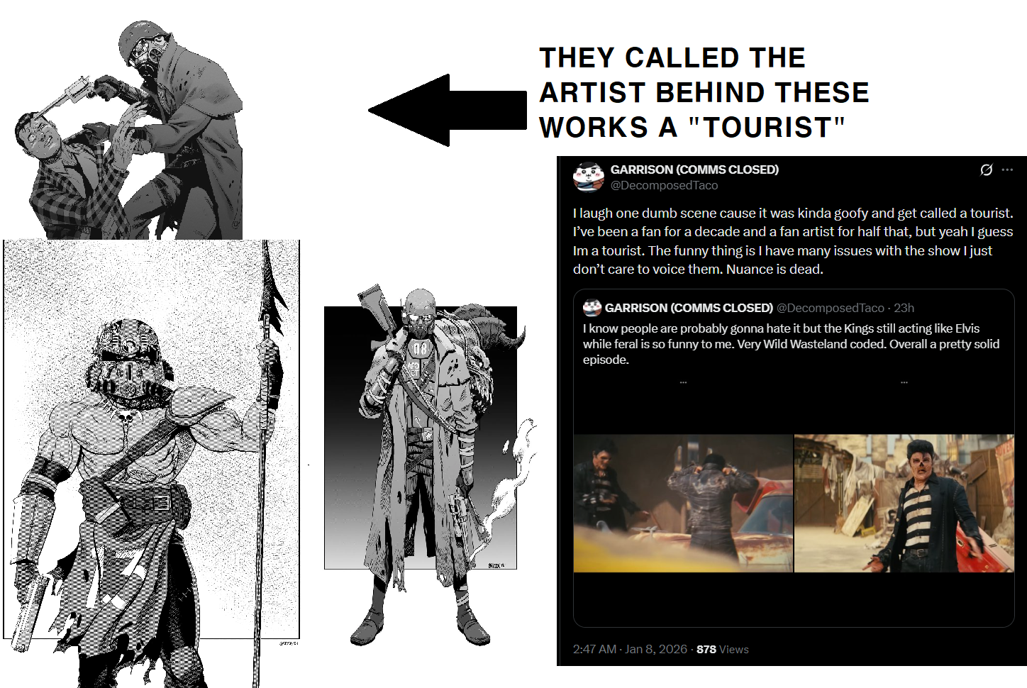 >>553084105I will ignore that you probably took this off reddit.Why would anyone call them a tourist over that? Yeah feral ghoul kings doing elvis stuff would 100% be a wild wasteland event.