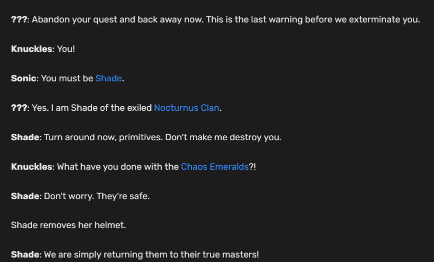 >>552975137>Eggman is also more cold to her in Japanese, even in Crossworlds.That sounds like it corroborates what anons said about the JP Frontiers rewrite being treated as the "true" script while Ian was a beta draft monkey so they could kill two birds with one stone by not having do western localization (distorting the gaijins' perception of things doesn't matter to them). Regardless, Evan's IDW Sage arc may unironically be the tone-setter for Sage going forward, assuming that they give Evan hard mandates like they did Shadow.