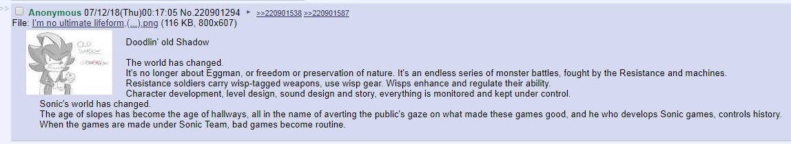 >>552975418>Sonic Forces is STILL a central "big thing" that happened in canon is absurd.I don't think people focus on this enough. The time between Forces' release and now is longer than between SA2's release and Unleashed.