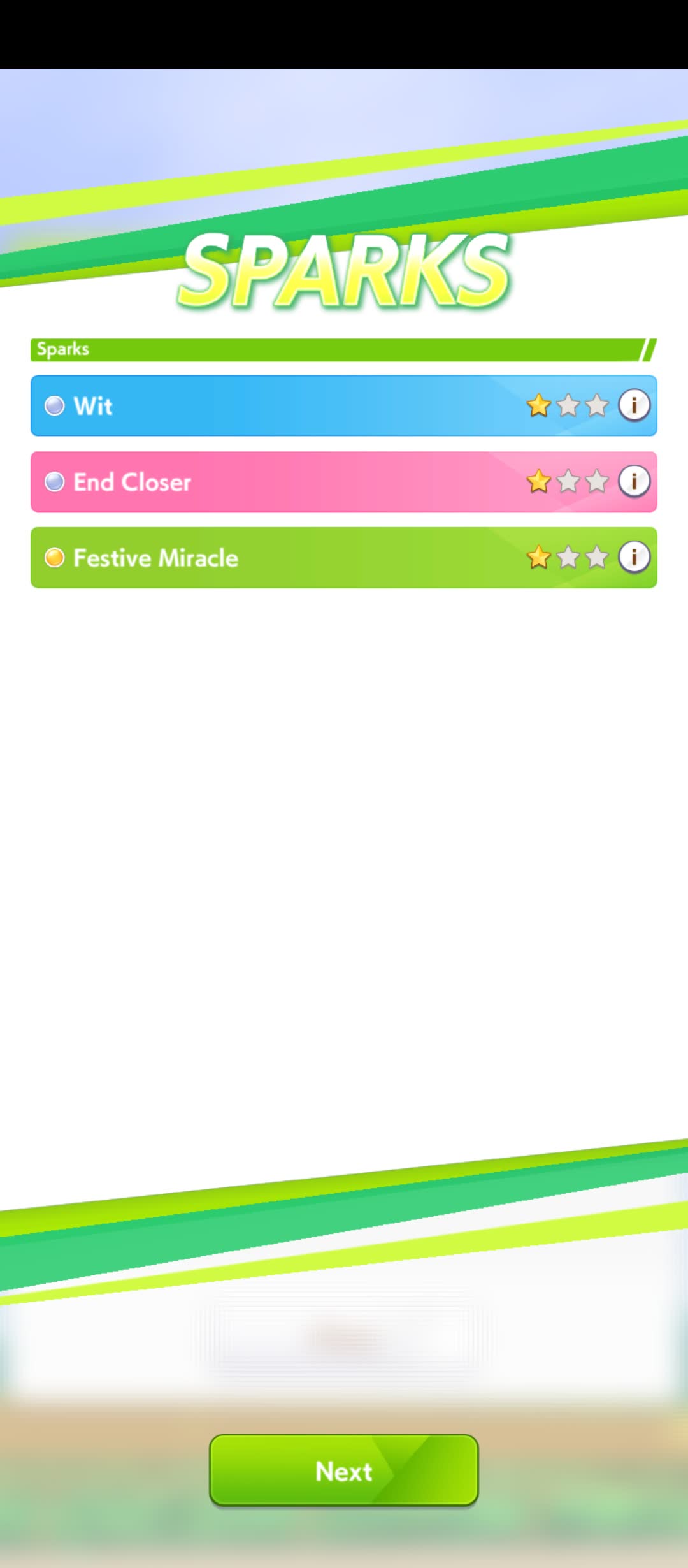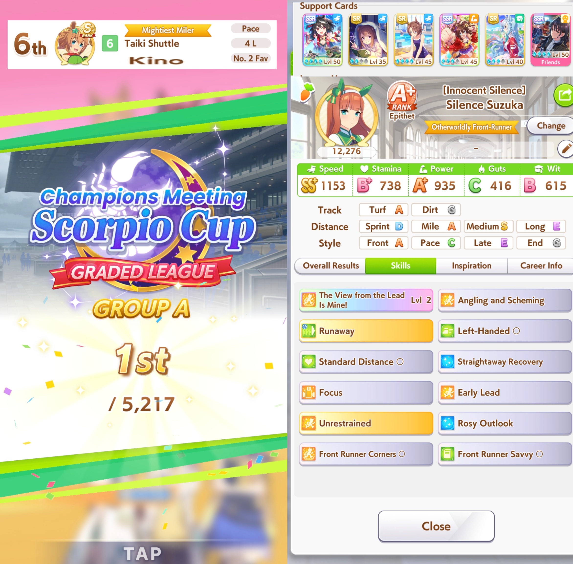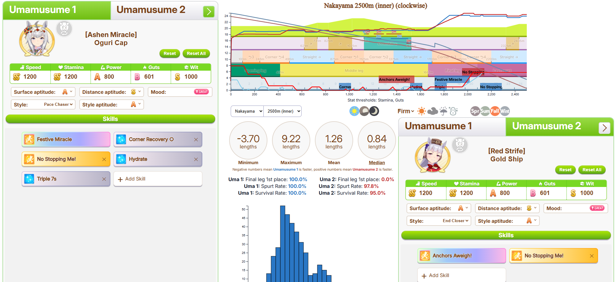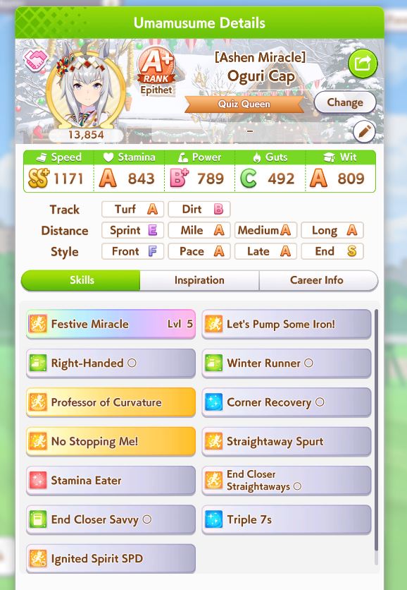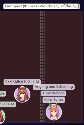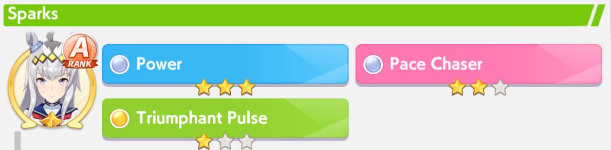 The same as Libra but with 1200 speed 900 stm 300 guts 900 power and the rest on wit. You can skip on the gold heal. Spurt+NSM is autowin so use the rest of your SP on whatever.