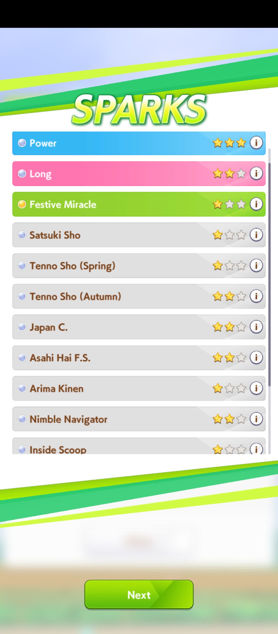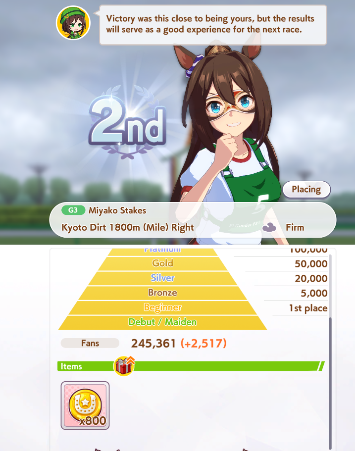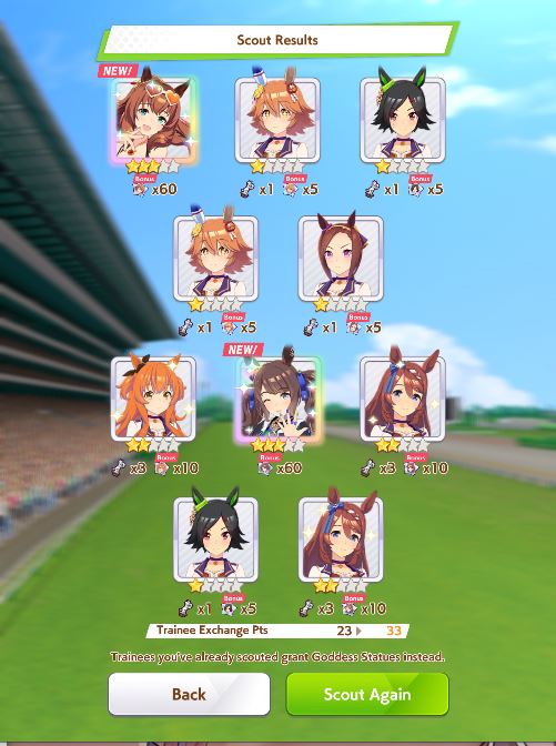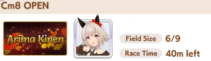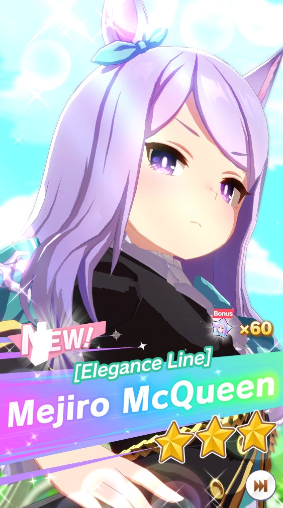 Current Rate Up: NY Sakura Laurel 3*, NY Ikuno Dictus 3*, Oguri Cap 3* (Cinderella Form), Stay Gold 3*, Air Groove (Speed SSR), Fine Motion (Power SSR) Inari One (SSR), Mejiro Dober (SR)