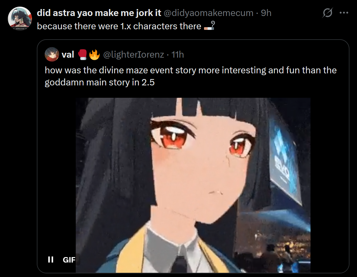 >>5530001942.1>Yixuan2.2>Yuzuha kills Alice's dad>Yixuan's sister gets blown the fuck out >Manato gets fucking tortured but he's fine2.3>Orphie tells us all about herself and shows a great liking to you, we have known her for less than day, interacted with her less than that>Seed is retarded but also funny I like her>Trigger is there >Isolde is redman>Quick time event>Ye's brother is sneaking around2.4>Manato fights his shadow self>Lucia reunites with his Dah-di >Yidhari >We see more of Ye's brother sneaking around2.5>Dialyn needs to get Banyue's balls, lest he be judge!>Banyue kills everyone but also saves some>Banyue's disciple betrays him cause he killed his sister>Dialyn reveals that Banyue did kill a lot of people but he didn't kill Ye's parents and that boy's sister specifically>Ye's brother became the buggiest and worst base ever implemented2.6>YE SHUNGUS>Zhao's father is voiced by wolverine for some reason>Zhao learns to love >Lockspring dies>Youkai has returned! or whatever he said >YE SHUNGUS OVERCOMES THE QINGYI SWORD >Continued in the qingyi sword event...