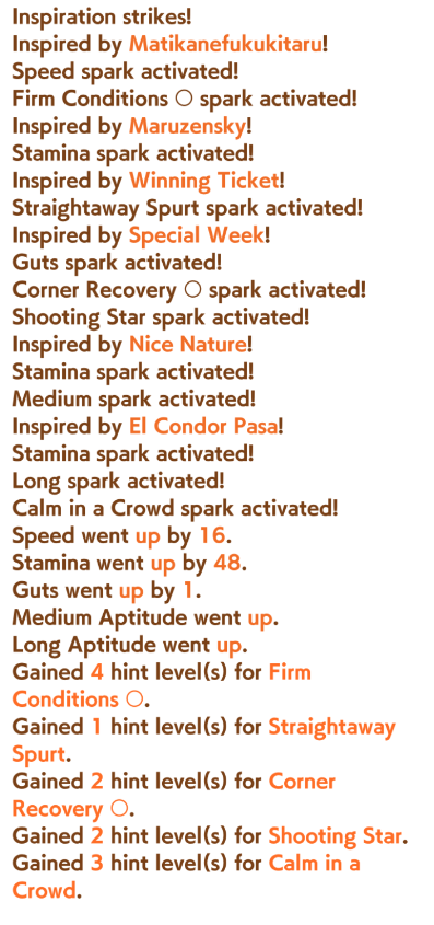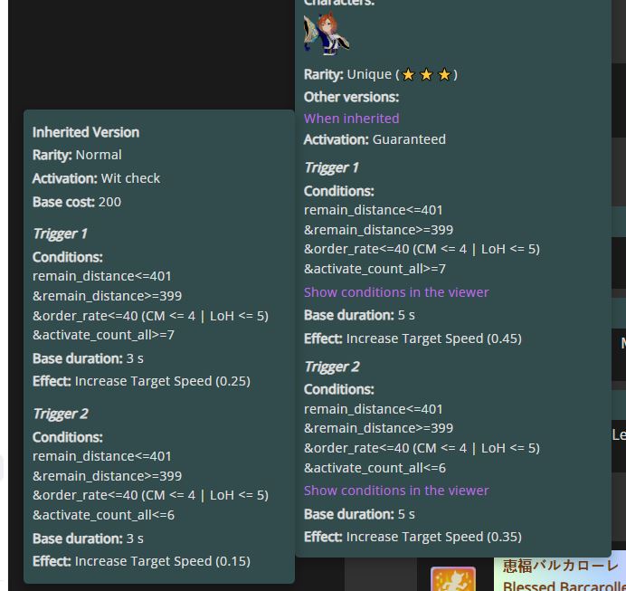 >>552989476year 3 and 4 umas have conditions such as "if on a 2400m tokyo course and you pass 2 umas in the second half of the race, get a velocity boost, bigger boost if you're top 3 favorite and have a name starting with O"