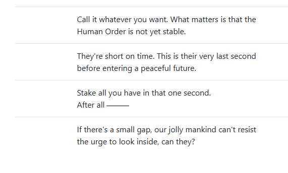>haha we’re just investigating some random pseudo singularities bro, it’ll be over in a year >part 2 ensues>haha it’s just a low stakes beast hunt, it’ll be over in a year>pic related is ominous as fuck and makes it sound like we’re gonna find out something we weren’t supposed to
