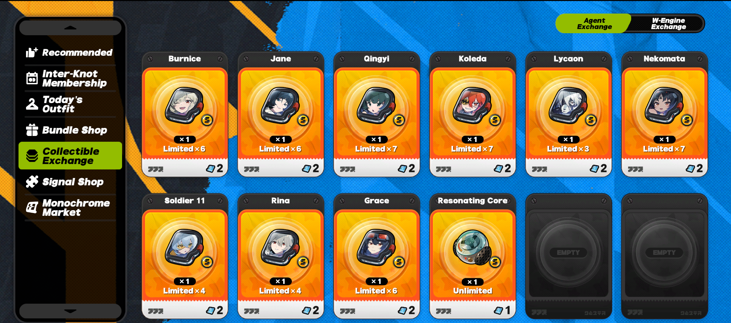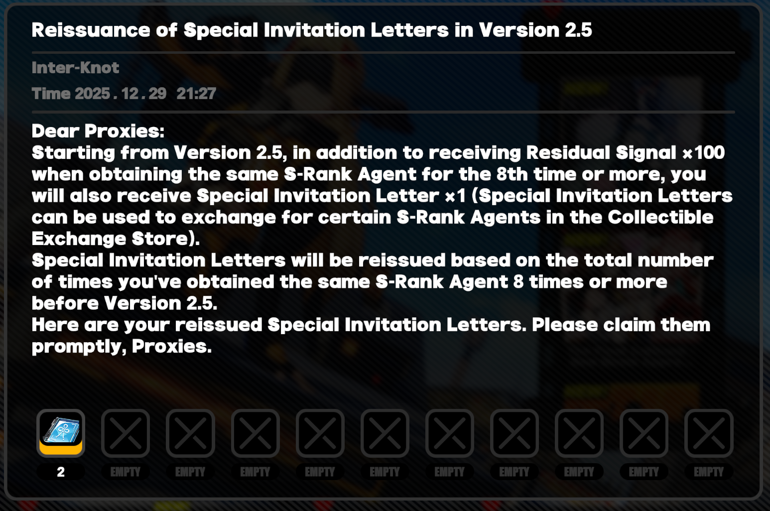 Previous: >>553003254>NewsAgent Record | Ariahttps://www.hoyolab.com/article/43039871Agent Record | Sunnahttps://www.hoyolab.com/article/43037944Version 2.5 Special Programhttps://youtu.be/Ldeqt2WMiYMTGA 2025 Special Videohttps://youtu.be/X-g1N9mNjzs>Newest Trailer/Teaser/Character demohttps://youtu.be/35fRoOYhE6Y (EN)https://youtu.be/BSKG5nhlj5s (JP)https://youtu.be/D_MtaEZRy3E (EN)https://youtu.be/eJBlfglfs-4 (JP)https://youtu.be/9Lshum4Peqw (EN)https://youtu.be/oCcNiUZ5ogU (JP)https://youtu.be/TU5Bt8MLPjk (EN)https://youtu.be/bviZmH3w5ew (JP)>Upcoming Events for 2.5https://zenless.hoyoverse.com/en-us/news/161728All-New Program 12/29 - 02/05Special Visitor 12/29 - 02/09Potential Hypothesis New Chapter Reforged 12/29 - 02/09Sword Seeker Chronicles 12/31 - 02/05Joint Investigation: The Divine Maze 01/03 - 01/22Shadow Riptide Clash 01/09 - 01/26Wish Filing Station 01/14 - 02/02Advanced Bounty: Area Patrol 01/16 - 01/21"En-Nah" Into Your Lap 01/21 - 02/05Angels and Delusions of Muse 01/21 - 02/05Data Bounty: Combat Simulation 01/30 - 02/04Angels of Delusion Training in Progress 01/30 - 02/09>Redeemable codes (claimable in-game or online)https://zenless.hoyoverse.com/redemptionZENLESSGIFTZZZCREATOR25ZZZ25MINAZHAOISFREEMEETTHEVOIDHUNTERShunguangWinterGiftZZZ2026>Resources and useful linkshttps://rentry.org/zzzlinkshttps://rentry.org/ZZZ-Friendshttps://rentry.org/ZZZ-Guilds>/zzz/ OP pastebin (use this if making new thread):https://pastebin.com/PzbMf13P