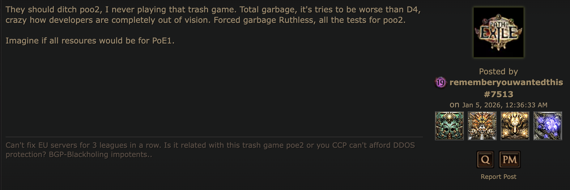 >>553142959Happy people don't feel the need to make others feel worse. You're a sad cuck. Also PoE2 will be around for years, you made up a culture war and picked the losing site.