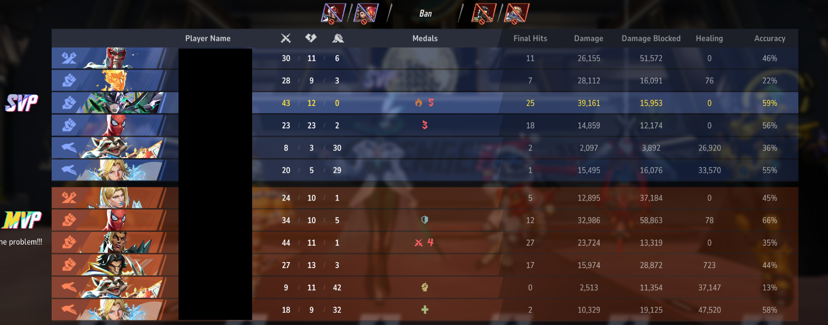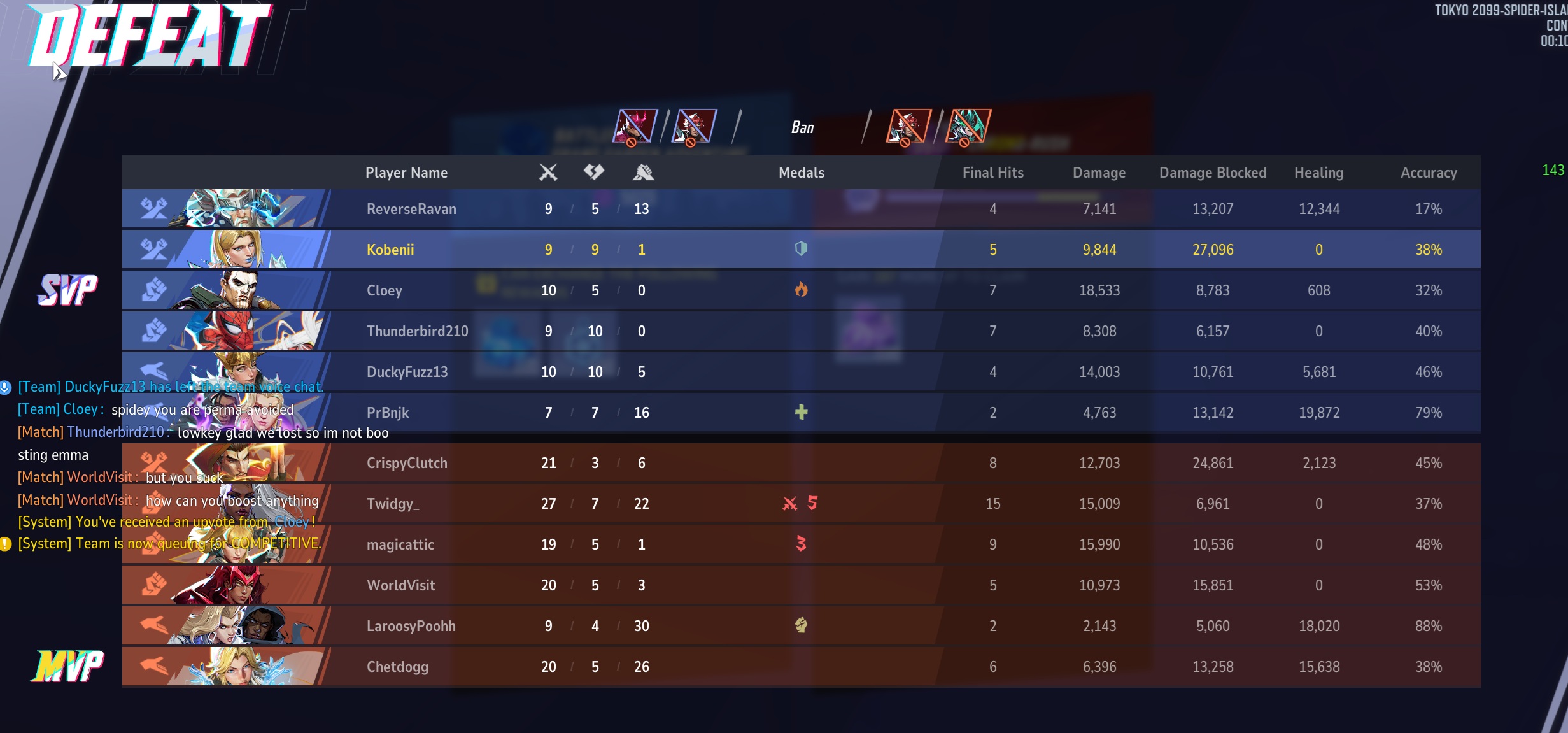 >>553145326He's not. He just has the best mobility in the game.>>553147225How?>>553154883leotard>>553157029Spider-Man has never been a damage farmer, or someone known to do a shit load of damage. If a Spider-Man has a lot of damage, then he is either not finishing off his targets efficiently or consistently or he is targeting Vanguards. Ideally you want a dps that does as little damage as possible while finishing off its targets because it means the opposite team has a harder time getting ult especially support ults. Do you people even play Spider-Man?>>553157810Kda matters but it isn't the full story. Also, I'd be more pissed at Punisher and Loki for helping the other team get support ults so much with all the damage they did. The only thing I'd probably be pissed at the Spider-Man for is dying so much but Spider-Man is a glass cannon without the cannon who relies on stringing together combos. >On top of that the emma somehow outdamaged the DPS heroOkay and? You realize Spider-Man has garbage damage, right? His strongest attack is his F key which does 70 damage. The same amount of damage as Hulk's right click. Spider-Man is not a damage sponge. >>553158458>same number of takedownsOkay and? Spider-Man wasn't the only person on that team performing poorly. >only two more finals Same as Punisher as well but he did way more damage feeding support ults.>less damageSpider-Man has trash damage. His right click does 30 damage, E does 55, and F key does 70. https://www.marvelrivals.com/heroes/index.html?id=feef5830-45b0-435e-8f7b-829241918b4d