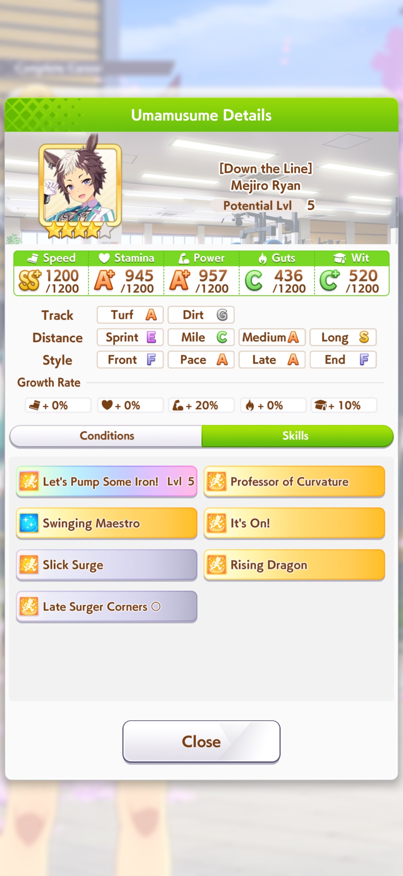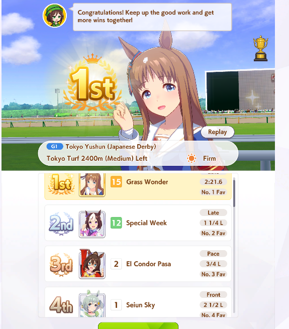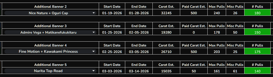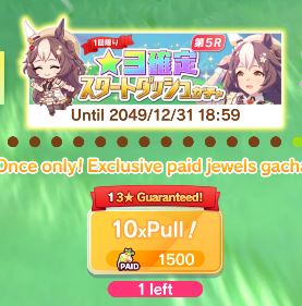 Current Rate Up: NY Sakura Laurel 3*, NY Ikuno Dictus 3*, Oguri Cap 3* (Cinderella Form), Stay Gold 3*, Air Groove (Speed SSR), Fine Motion (Power SSR) Inari One (SSR), Mejiro Dober (SR)