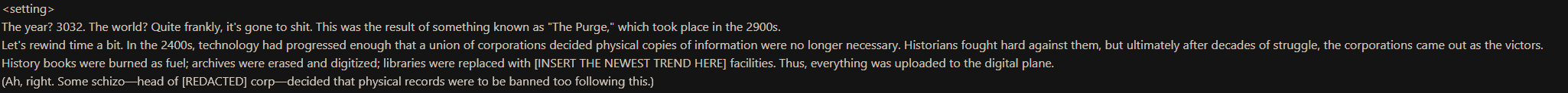 >>553070114>post log >nobody reads it >at best you get told slop/kino>chat with bot>all i do is indulgent bullshit nobody will care about>or pure, degenerate coom>can't share any of that in currentcg so i never do >see log posted>open it up and read it >not of my bot so i no care>not of a card i care about, so i no care >log itself is boring/not to my taste and i can't even force myself to think of a comment outside of kino or something>close log>hide post out of guilt that's just how it is