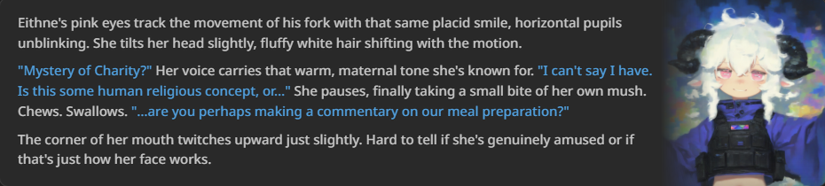 /aicg/ - A general dedicated to the discussion and development of AI chatbots#679 - Implied Cat Girls Edition ▶https://rentry.org/aicg_vg_memo▶This general is for discussion of the interactive experiences you can build on top of AI chatbots.>NewsGLM 4.7 https://docs.z.ai/guides/llm/glm-4.7Gemini 3 Flash https://blog.google/products/gemini/gemini-3-flash/GPT-5.2, with price increase to $1.75/$14 per million token https://openai.com/index/introducing-gpt-5-2/Deepseek 3.2 https://api-docs.deepseek.com/news/news251201additional info: https://aicg.neocities.org/info>FrontendsSillyTavern: https://docs.sillytavern.appRisuAI: https://risuai.netAgnai: https://agnai.chat | https://rentry.org/agnai_guides_>Botshttps://characterhub.org | https://chub.aihttps://realm.risuai.nethttps://char-archive.evulid.cc/shutdown.htmlhttps://partyintheanchorhold.neocities.orghttps://aicg.neocities.org/bots>Modelsjailbreaks: https://rentry.org/jb-listinggpt: https://platform.openai.com/playground | https://platform.openai.com/docsclaude: https://console.anthropic.com | https://docs.anthropic.com | https://rentry.org/how2claudegemini: https://gemini.google.com | https://ai.google.dev/docs | https://rentry.org/gemini-qrdeepseek: https://chat.deepseek.com | https://api-docs.deepseek.comlocal: >>>/g/lmg | https://aicg.neocities.org/local | https://openrouter.ai>Botmakinghttps://aicg.neocities.org/botmakinghttps://desune.moe/aicharedhttps://agnai.chat/editor>MetaOP templates: https://rentry.org/vgOP | https://rentry.org/aicgOPaicg botmaking events: https://aicg.neocities.org/eventslore: https://rentry.org/aicg_chroniclesrice: https://aicg.neocities.org/ricingservices assessment: https://rentry.org/aicg_metalogs: https://sprites.neocities.org/l/r | https://chatlogs.neocities.orgPrevious: >>552953380
