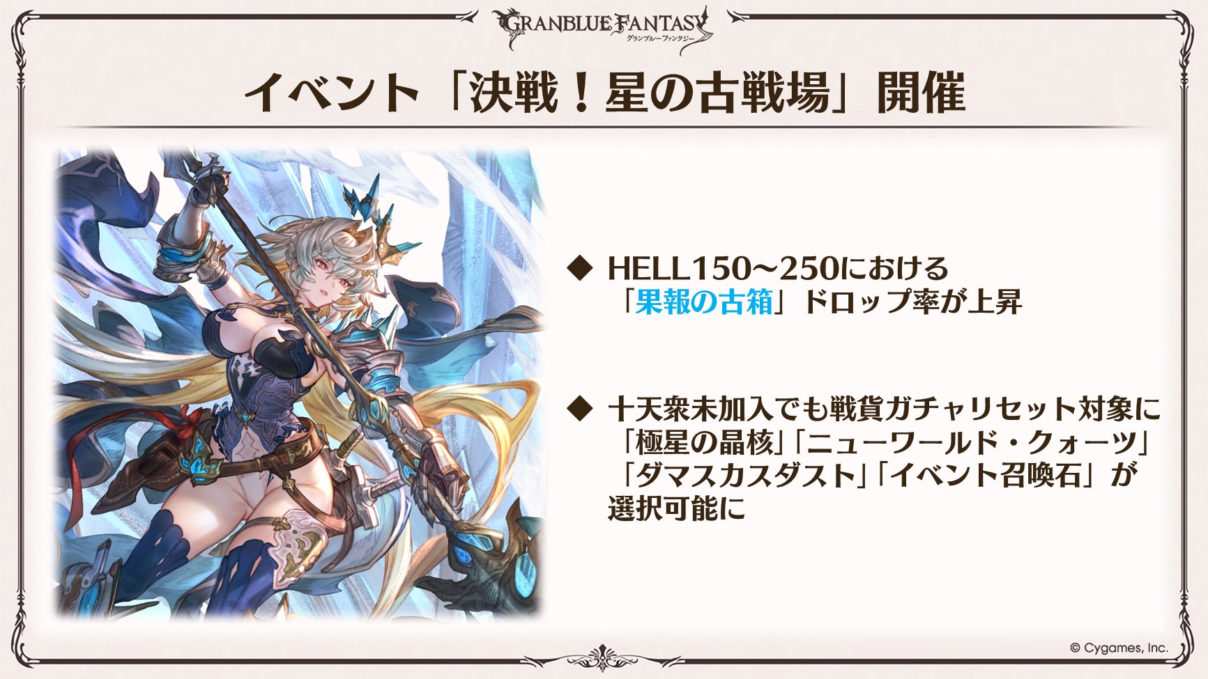 >Recent NewsExtra Drops (Dark) - (01/04 - 01/10)New Year's Special Campaign - (12/23 - 1/12)Daily Roulette/200 Crystals, Bubz Summon Giveaway, MSQ Rewards, CEQ, x1.5 XP/RP, ½Off AP/BP/Hosts, ½Off Side Story & Trade items, FP Special, x3 AH Pro, Double Sephira Gauge etc.Odious Raid series (Fire & Water) - LiveOdious Raid Series - February & AprilAlbert, Medusa & Caim NY Skins - LiveMakura FLB - January"Showtime" Added to Side Stories - 01/20QoL - Subaha, Hexa and Mastery Trial Nerfs - FebruaryNew Xeno Realm in Sandbox - FebruaryFinal Tower of Babyl & Permanent AdditionPro Skip for World Treasure Mats - MarchSiete & Vikala 12th Anniversary Skins - MarchLancer Origin Class - MarchSteam Client - 03/10Roadmap: https://gbf.wiki/User:Umikin/Timeline>January Schedule12/29 - 01/06 - Tale of the 10801/01 - 01/16 - New Year's Messages01/07 - 01/14 - Rise of the Beasts01/14 - 01/21 - Monscian (Rerun)01/21 - 01/28 - Unite & Fight (Earth Adv.)01/28 - 02/06 - Story Event>Future Schedule02/06 - 02/13 - Records of the Ten (Uno/Quatre)02/13 - 02/19 - Freedom's Dirge (Rerun)02/13 - 02/28 - Valentine Messages02/14 - 02/28 - Alchemist Event02/19 - 02/26 - Dread Barrage (Wind Adv.)>How to StartGo to https://game.granbluefantasy.jp in any Chromium-based browser>READ THE FAQ before posting - It will answer most of your questions if you're new or learninghttps://gbf.wiki/FAQ>Helpful links - These links contain useful information like important guides and other stuffGranblue Fantasy Toolbox - https://mizagbf.github.io/GBF Advanced Search - https://gbfas.ioGBF Grid and Teambuilding - https://gbfguide.comMain Story Recap - https://calico.nekoweb.org/gbf/story/Wiki Advanced Grids - https://gbf.wiki/Advanced_Grids/gbfg/ Mega Pastebin - https://pastebin.com/xHkyQTy8/gbfg/ Crew Directory - https://rentry.org/gbfgcrewsPrevious >>552952027