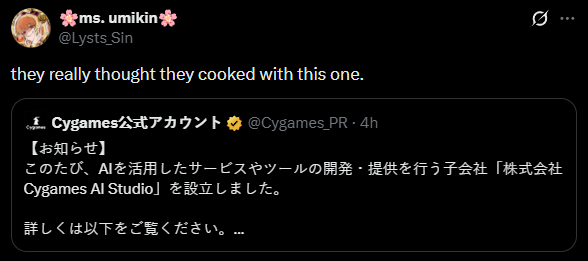 >“Players who enjoy character-oriented games don’t like AI-generated content. Even I feel a strong aversion towards spending money on images that are generated with a simple click,”>“Nobody wants to spend money on AI-generated images,”any grubs for this feel