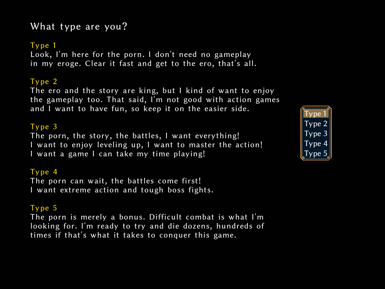 I like if an H game doesn’t take itself seriously through the whole run. With lots of laughter to be had even if your character is scum and fat.