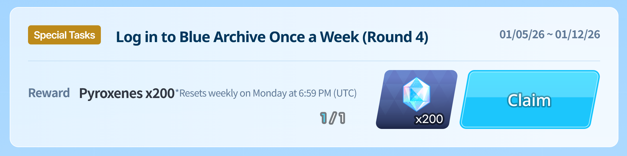 Previous Thread: >>553069930>Guides, Resources and useful links:https://rentry.org/bagguides>/bag/Circles/Clubs/Friends:https://rentry.org/holdingthebag>4koma, Manga, Side Content, PVs & Shortshttps://rentry.org/bacontent>>(JP) – JST>Banners:>1/7 After Maint – 1/20 10:59KisakiReijoYuuka (Track) (Limited)Mari (Track) (Limited)>News:5th Anniversary Website: https://5th-anniversary.bluearchive.jpPatch notes: https://bluearchive.jp/news/newsJump/618>Events:The Senses Descend – 1/7 After Maint – 1/20 10:595th Anniversary Countdown Login Bonus Event – 1/13 4:00 – 1/20 3:59>Content:Joint Firing Drill (Escort) – 1/7 After Maint – 1/14 3:59Grand Assault: ShiroKuro (Urban – Torment w/Special & Elastic Armor) – 1/14 11:00 – 1/20 3:59Limit Break Assault: The Fury of Set (Field – w/Light Armor) – 12/25 11:00 – 1/20 3:592x Hard – 1/7 4:00 – 1/14 3:592x Scrimmage/Commission – 1/14 4:00 – 1/20 3:59>>(GLOBAL) – UTC>Banners:>1/6 2:00 – 1/13 1:59Toki (Limited)Nagisa (Limited)KannaChiaki>News:Patch notes: https://forum.nexon.com/bluearchive-en/board_view?thread=3317296>Events:My Office: https://bluearchive.nexon.com/user/myoffice>Content:Grand Assault: Binah (Urban – Torment w/Elastic Armor) – 1/6 2:00 – 1/12 18:59Limit Break Assault: Tiphareth (Indoor – w/Heavy Armor) – 12/17 2:00 – 1/12 18:593x Commissions – 1/5 19:00 – 1/12 18:593x Normal – 1/5 19:00 – 1/9 18:592x Account EXP – 1/9 19:00 – 1/11 18:593x Hard – 1/9 19:00 – 1/12 18:592x Bounty – 1/12 19:00 – 1/19 18:592x Account EXP – 1/16 19:00 – 1/18 18:59