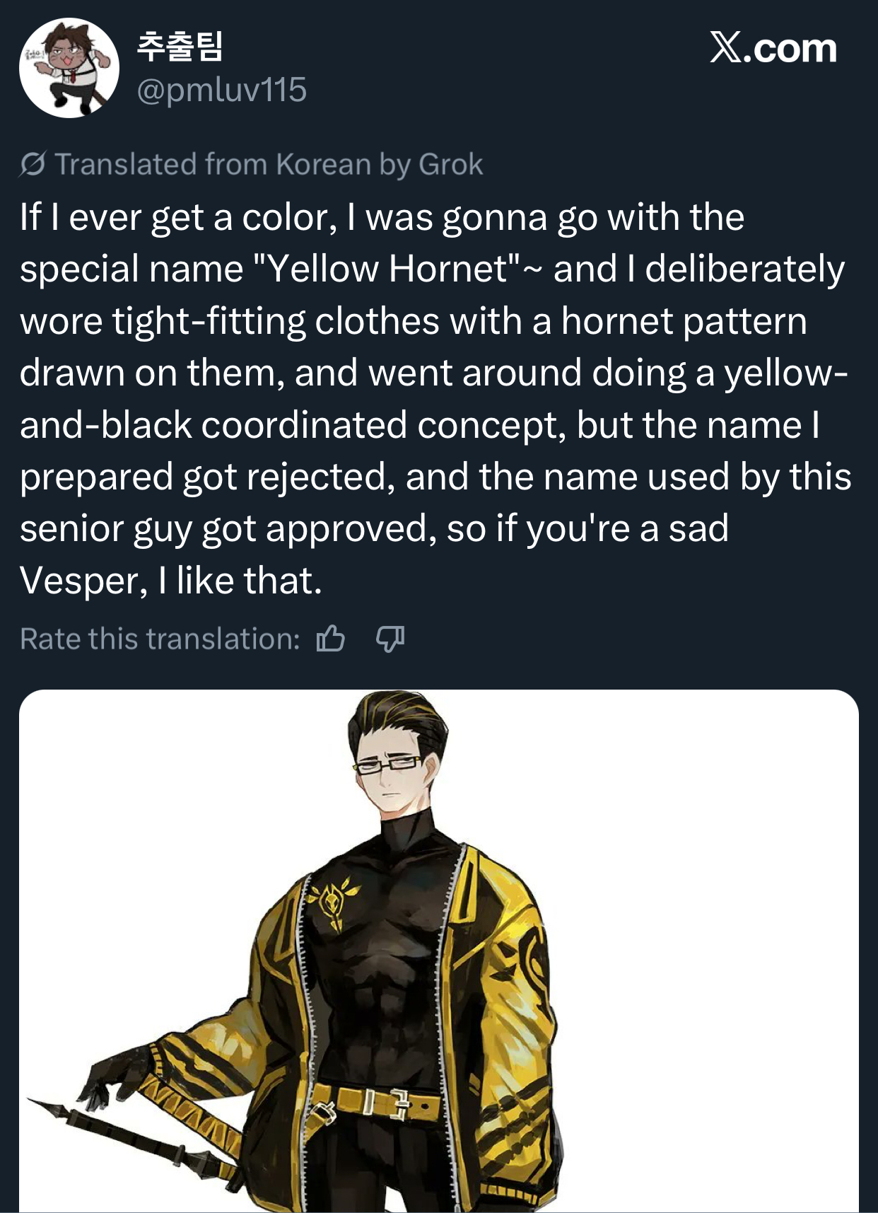 >Spend your whole life building up the image of Yellow Hornet (Your name is literally a species of hornet)>Get called Yellow Harpoon (Ezra suggested it)