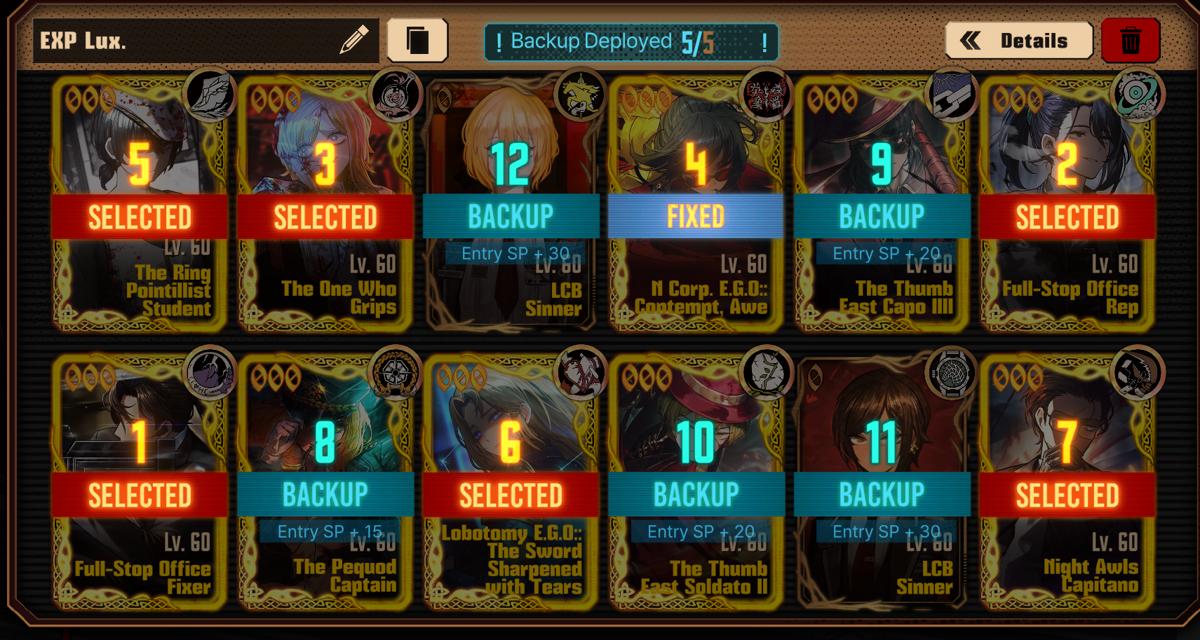 Previous thread: >>553085141Season 7 - Kumo no Ito2025.12.31 — Mirror Dungeon #6 - Mirror of Immortality2025.07.03 —Refraction Railway Line 5 - Merry Go Round2025.02.20 —>Current Events>Upcoming Extractions>Current Extractions2025.12.31 — 2026.01.15[000] The Index Proselyte:【Paper Slip】 Faust[000] LCA Udjat Vanguard Team 3 Leader Outis2026.01.08 — 2026.01.22[000] The Index @#$#: 【Device】 Don Quixote2025.12.31 — 2026.01.22Target Extraction: [ Ryoshu ] ID & E.G.O>FAQs! This game is directly tied to the setting of Project Moon's previous games, Lobotomy Corporation and Library of Ruina, and is set after both. Expect spoilers for those games in this thread.! The tutorial is important.>Download linksAppStore: https://apps.apple.com/app/limbus-company/id6444112366Google Play: https://play.google.com/store/apps/details?id=com.ProjectMoon.LimbusCompanySteam: https://store.steampowered.com/app/1973530/Limbus_Company/>Other linksOfficial twitter: https://twitter.com/limbuscompany_bOfficial youtube: https://www.youtube.com/@ProjectMoonOfficialOfficial site: https://limbuscompany.global>Required readinghttps://mega.nz/folder/xosDkZ5Z#Wt4JpUt5Bb2XG77pxuuXpw>For all your EGO and Sinner info needshttps://limbus.kusoge.xyz/https://gll-fun.com/en/>Useful resources and a general guidehttps://rentry.org/lcg_resourceshttps://rentry.org/lcbguidehttps://rentry.org/LCB_optimal_grind_guidehttps://lcb-days-since-last-id.carrd.co/https://lcb-days-since-last-ego.carrd.co/>Countdownhttps://lcbcountdown.carrd.co/