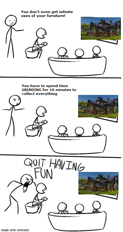 I may be engaged presently in somewhat tedious grind myself, but at least it has a tangible payoff and the rewards I am seeking will never become deprecated. This plate of totally inedible steaks will be mine forever.