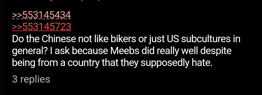 >>553145434>>553145723Do the Chinese not like bikers or just US subcultures in general? I ask because Meebs did really well despite being from a country that they supposedly hate.