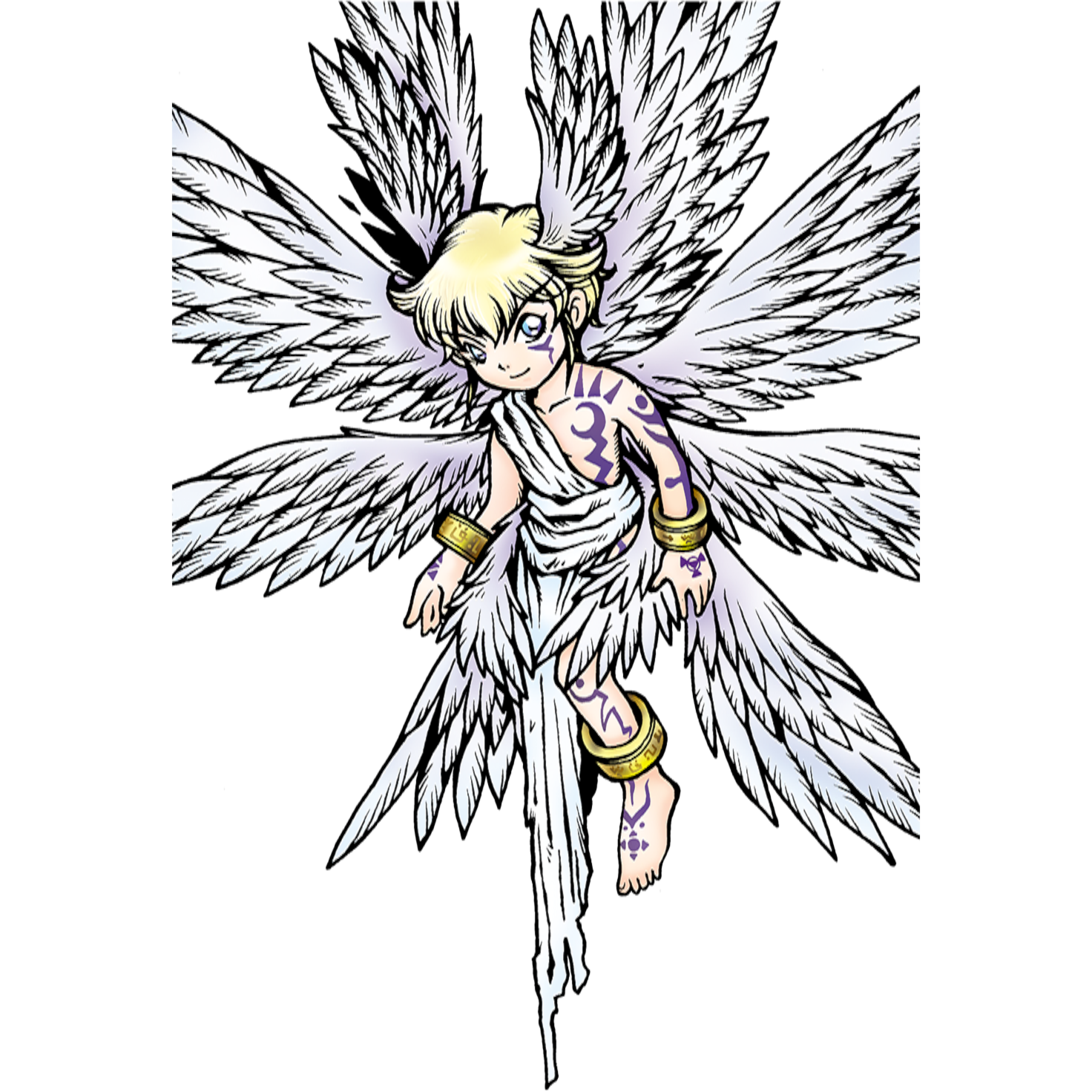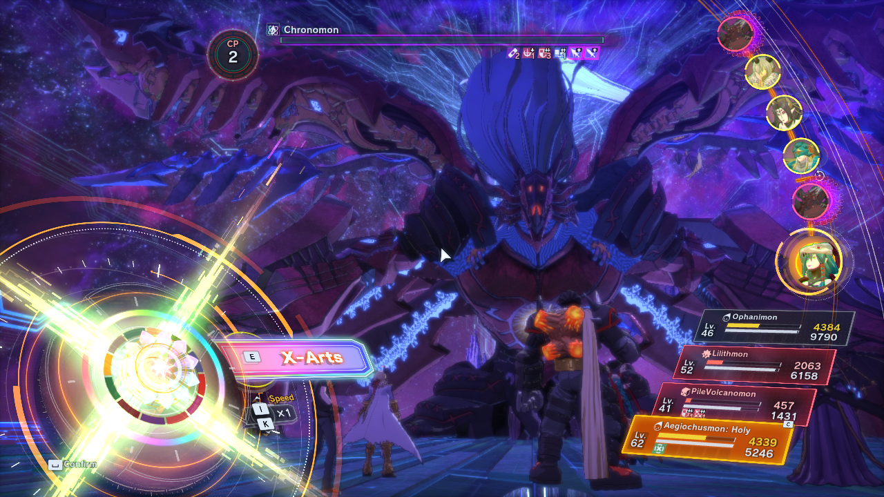 >Holy Mode>Mega/Vaccine/God ManProfileA Deity Digimon said to be the manifestation of systems that preside over time. The flow of time within the Digital World is nebulous and has often been disrupted by clashes between powerful Digimon and even natural disasters. Chronomon is tasked with repairing time and space in the case of such events. When mending time-based anomalies, Chronomon also removes the very instance of its manifestation from reality, meaning that none have ever witnessed its form. It is for this reason that the existence of Chronomon is only ever briefly touched on in legends. Its special moves are Holy Flare, a sacred flame that incinerates the very existence of those who would maliciously corrupt space-time, and Chronos Crop, an unguardable attack in which Chronomon uses its wings like blades to sever the enemy along with time and space.