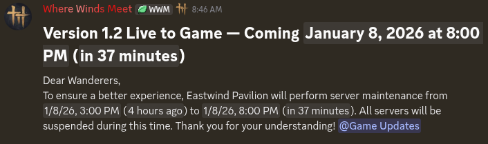 Previous Realm: >>553038809Patch day editionJanuary Roadmap:https://x.com/WhereWindsMeet_/status/2005896637705543813Where Winds Meet is an epic Wuxia open-world action-adventure RPG set in ancient China at the tenth century. Players will assume the role of a young sword master as they embark on a journey to uncover the mysteries of their own identity. Let the wind carry your legend on an epic journey to the East!Download Now:PS Store: https://playstation.com/games/where-winds-meet/Steam: https://store.steampowered.com/app/3564740/Where_Winds_Meet/Official PC Launcher: https://wherewindsmeetgame.com/news/official/GlobalLaunch/InstallGuide.htmlWebsite: https://www.wherewindsmeetgame.com/Maps:Chinese: https://map.17173.com/yysls/maps/qingheEnglish (global): https://mapgenie.io/where-winds-meet/maps/worldNeed help figuring out dailies and weeklies?WWM Helper: https://besaids.github.io/WWM-Helper/home/vg/ Guilds:>Name: Sage>ID: 10001992>Region: NA79/100>Name: HeavenlyClover>ID: 10036681>Region: NA99/100>Name: NoFunAllowed>ID: 10149590>Region: EU89/100Search by ID and then send a message to the guild leaders saying you're from /vg/.4chan Group Chat:Social > Friend > Group Chat > Enter the Code 100008774Codes:Settings > Other > Exchange CodeWWM251115WWMDEVTALKYYSLSTIBtf33hxjmjc