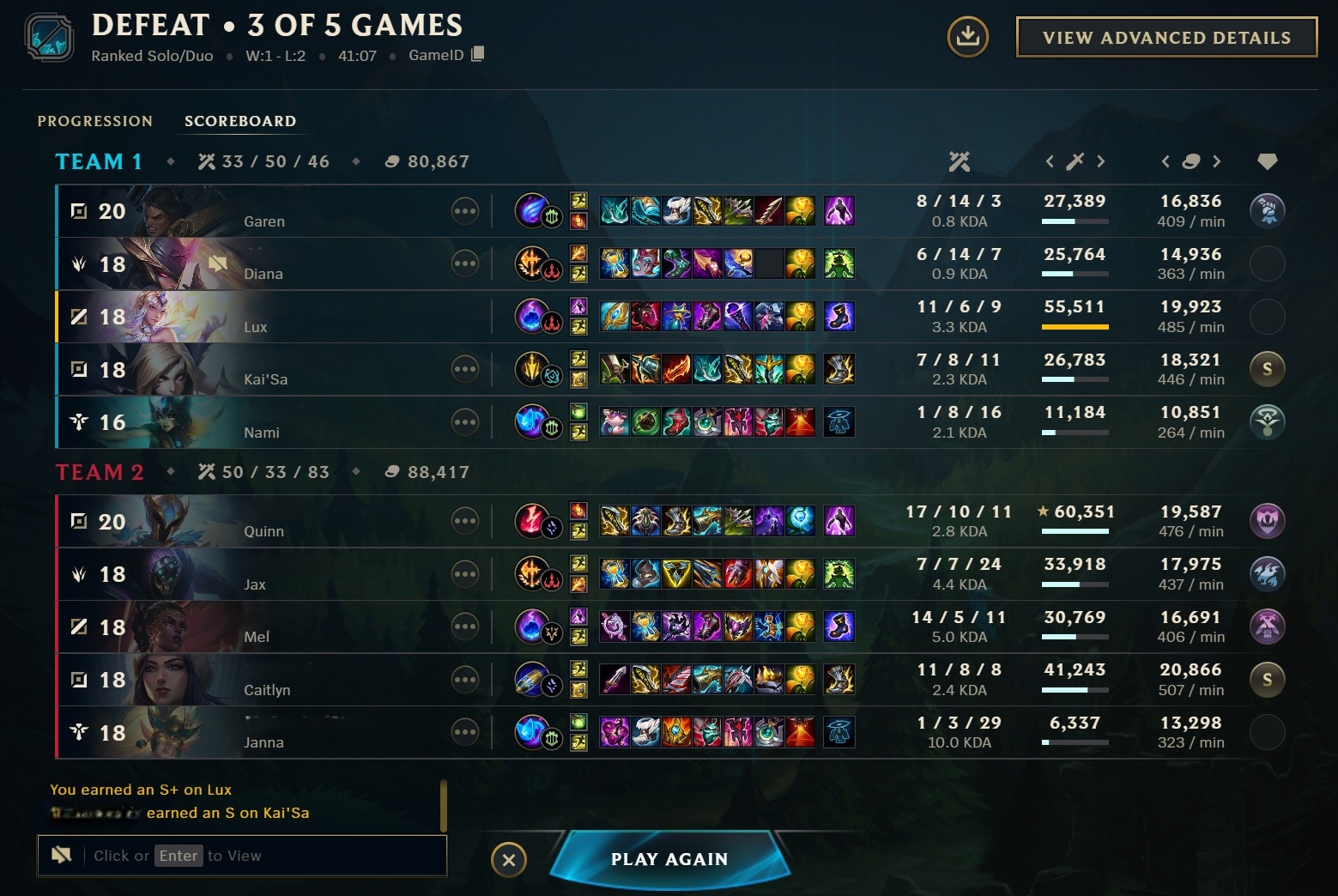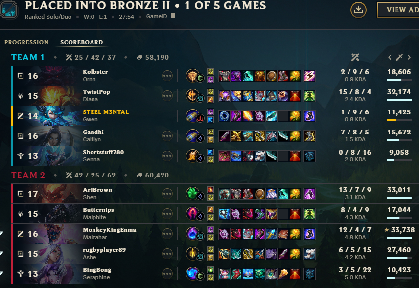 Where were you placed after your first game?P4 last season, won game 1 and got placed S1 with 60 LP.Our Vel'Koz gigafed their Fizz, but we picked their Jungle and Supp on Elder and won.