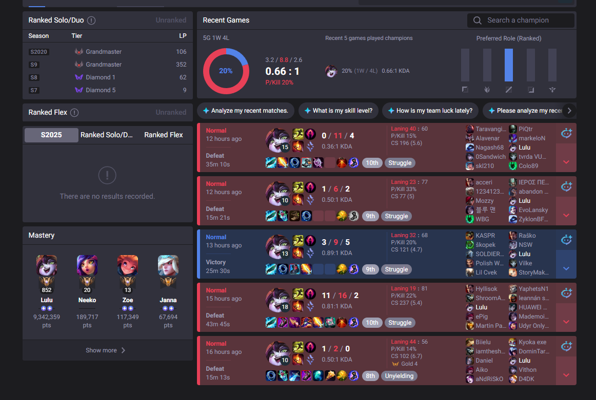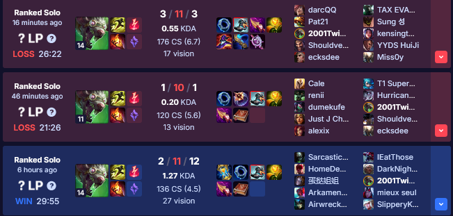 >>553179504it gets even worse, I had his u.gg up and refreshed it after a game, he's gone a combined 6-32-16 in his past 3 gamesLOL