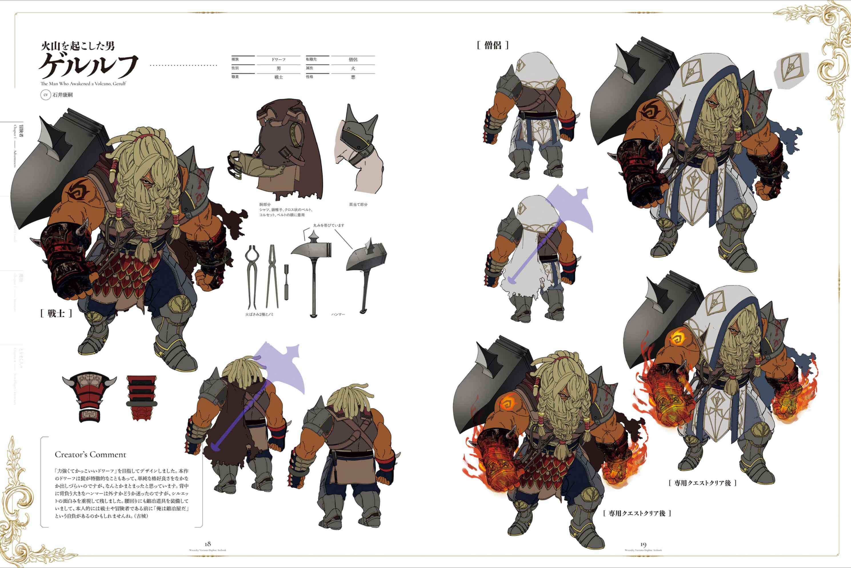 GerulfI aimed to design a "strong and cool dwarf." The dwarves in this game have distinctive beards, so it was difficult to create a simple cool look, but I think I managed to pull it off. I wondered whether to remove the large hammer he carries on his back, but decided to keep it, as it adds interest to the silhouette. He is also equipped with blacksmithing tools around his waist, which perhaps shows his pride in being a blacksmith before he is a warrior or adventurer. (Kojo)