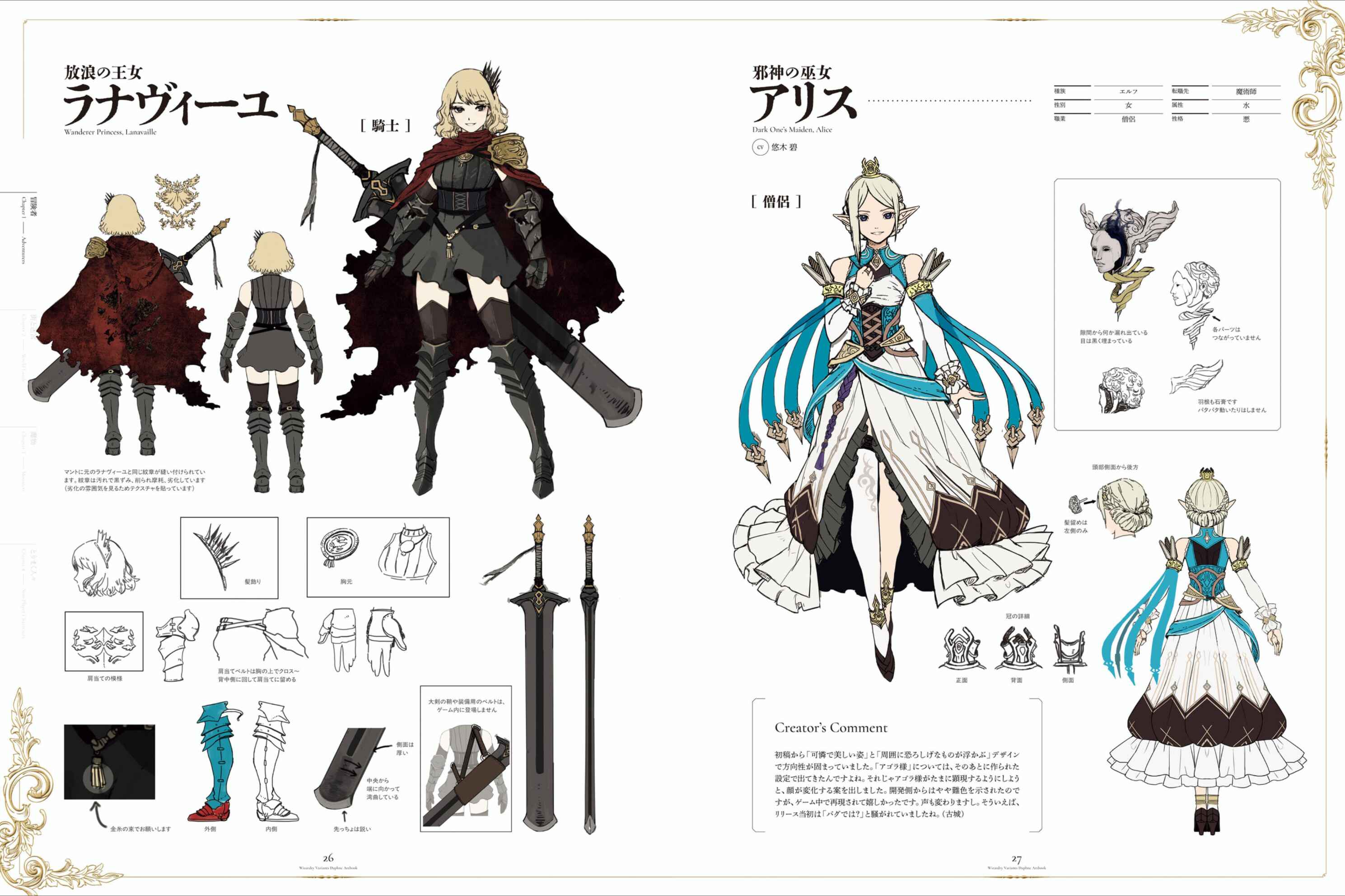 LanavailleThe concept is a "princess knight." I added a few twists to her appearance, with shackles around her neck and hands, scratches on her armor, and dirt on her cloak, making her look like she wonders what happened in her past. Even I was surprised to find out that she speaks more depressing lines than I expected! I think everyone is curious to know what happened, so please try out the special quest. I'm sure you'll grow to love her. Her style change is also a complete 180-degree change to her cheerful personality, which is another surprise and mystery... After narrowing it down to around six patterns in the first draft, the one that remained after an internal survey was "Wandering Lanavielle." It would be great if even rejected ideas could see the light of day someday. (Furujo)