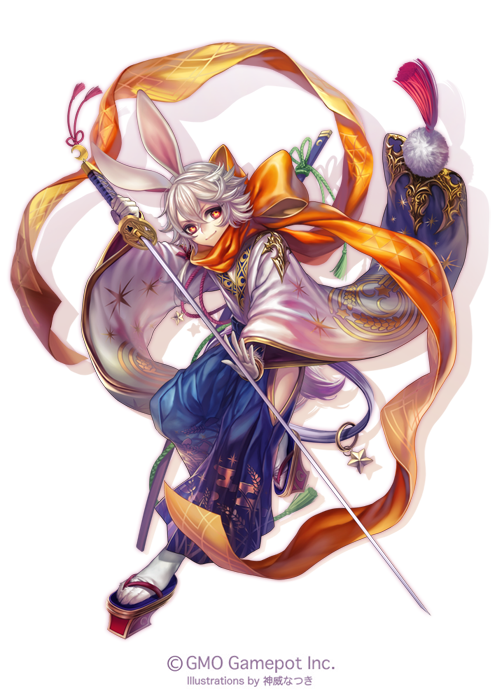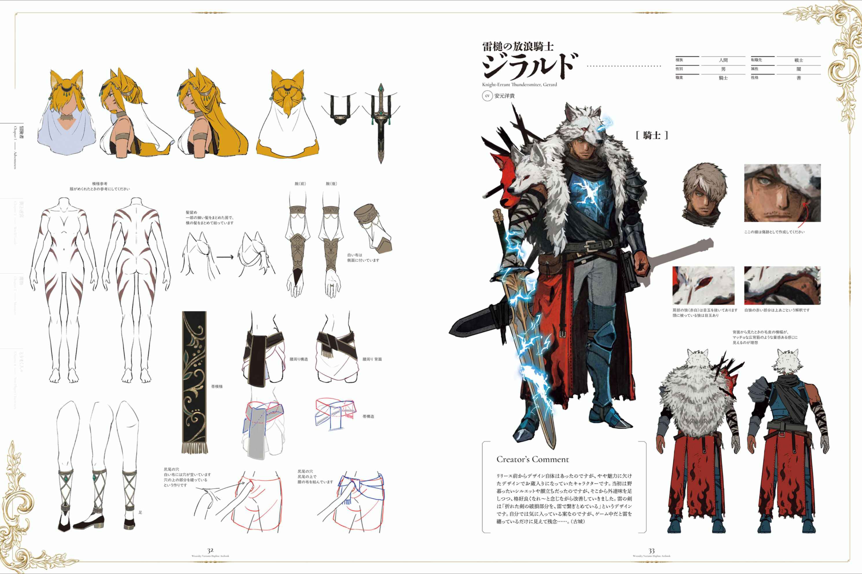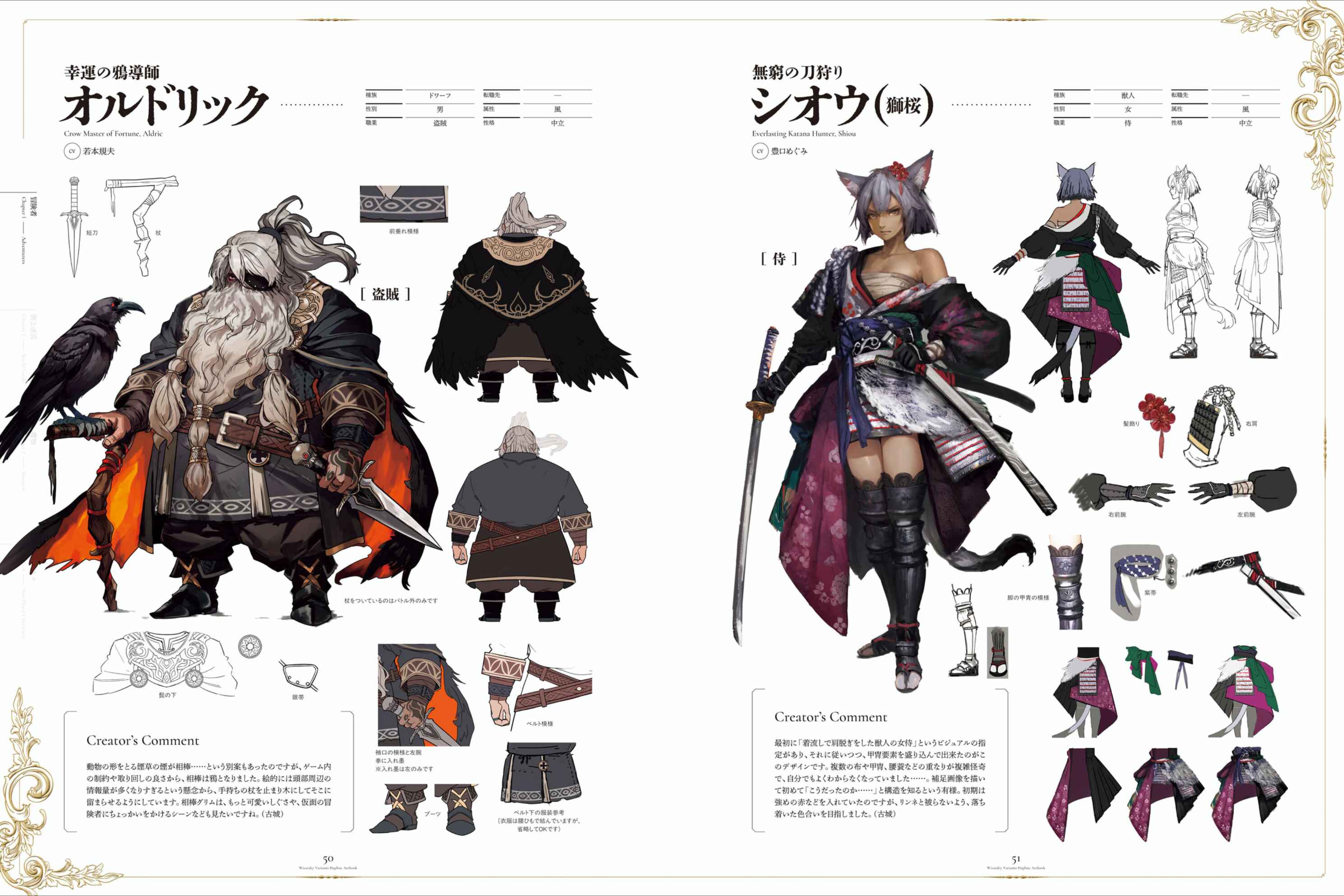 AldricAnother idea was for the companion to be cigarette smoke that takes the shape of an animal, but due to in-game restrictions and ease of handling, the companion was decided to be a crow. Visually, there was a concern that there would be too much information around the head, so the staff he is holding is used as a perch and he is perched there. I would like to see Grimm's companion act more cutely, or have him tease the masked adventurer.ShiouInitially, the visual requirement was "a female beast-man samurai in a casual kimono with her shoulders off," and this design was created by following that and incorporating elements of armor. The overlapping of multiple pieces of cloth, armor, and waist support was so complex and bizarre that I couldn't even understand it myself... It wasn't until I drew the supplementary image that I realized "Oh, so that's how it was..." The structure was finally realized. Initially, I used strong reds, but I aimed for a more subdued color scheme so as not to overlap with Linne.Sounds like the Drecom devs were too incompetent for the Aldric smoke familiar idea.