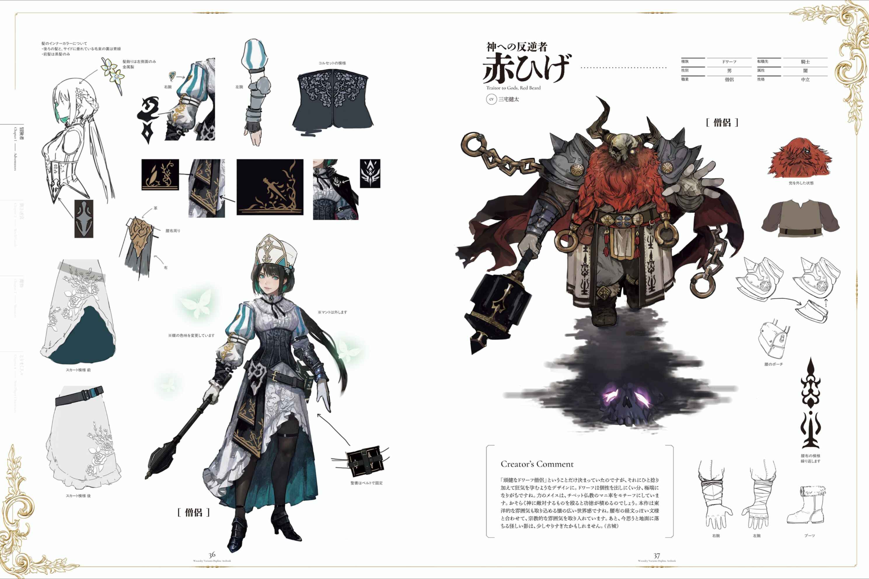 BenisThis is an adventurer that I was given relatively free rein to design. I had the idea in place early on, but I remember going through a lot of trial and error with the hairstyle and hair color. I tried out a variety of hair colors, but I couldn't deny that it felt too otherworldly, so I settled on black hair with a blue inner color. I'm happy that she's as strong as the image of a "beautiful swordswoman with excellent swordsmanship," and is active in a variety of situations.Red BrickAll that was decided was that he was a "sturdy dwarf monk," but I added a twist to the design to make it seem insane. Dwarves tend to be extreme because it's hard to express individuality. The Mace of Power is based on the prayer wheel of Tibetan Buddhism. Perhaps hitting those who oppose the gods will earn you merit. This work has a broad-minded worldview that can also incorporate an oriental atmosphere. Combined with the sutra-like pattern on the loincloth, it incorporates a religious atmosphere. Also, thinking about it now, the mysterious shadow falling on the ground may have been a bit too much.