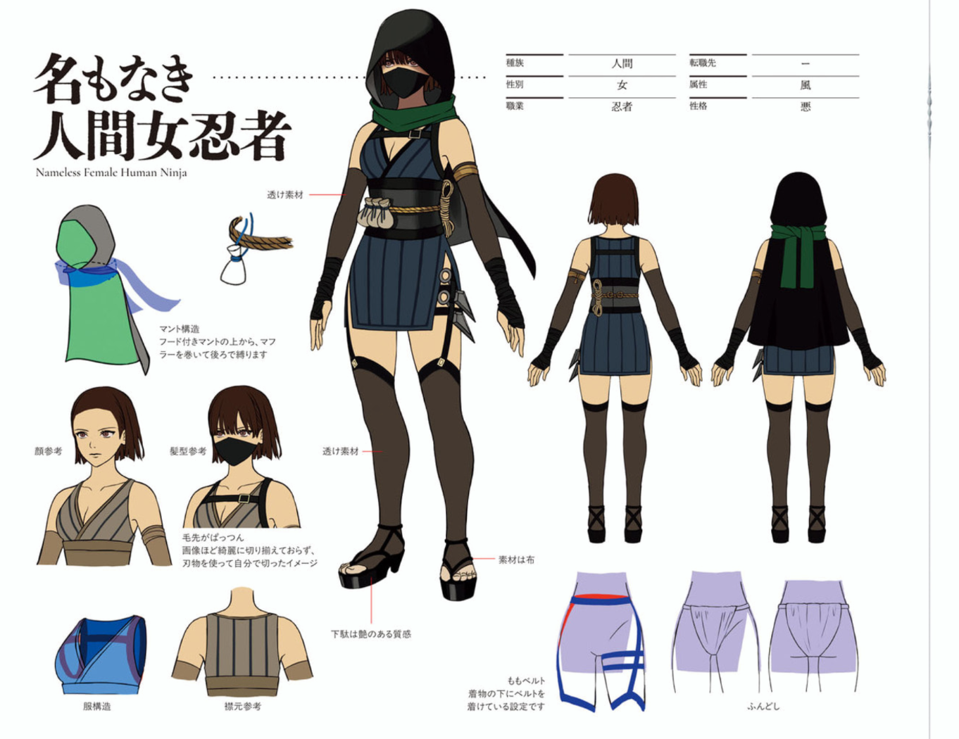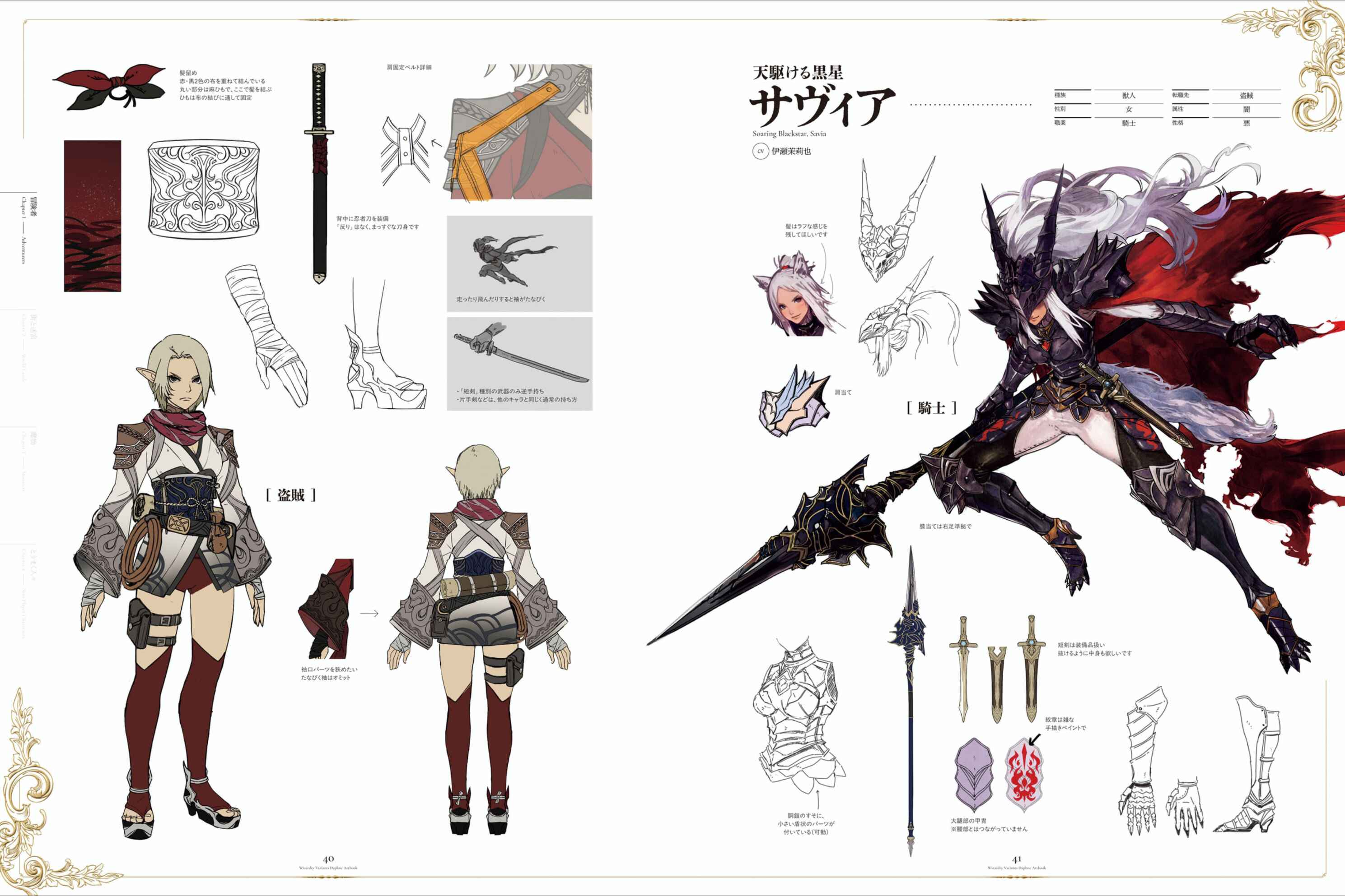 RinneI wanted to express a sense of strength and sternness that sets her apart from a simple "kunoichi," so I paid particular attention to the face. I designed her with sharp eyes and a stern expression, with her mouth tightly closed, to convey the feeling that she has gone through a difficult ordeal to become a ninja. She doesn't run for long periods in the game, but I made the sleeves long so that they flutter when she does. It also gives her a cool silhouette. It was my mistake that the kimono is fitted backwards in the design drawing...SaviaThe design was based on the theme of "the fastest black knight." It deviates slightly from the normal balance of the human body, with longer limbs and slightly thicker thighs. I wanted to give the impression that she is good at "running" and "jumping." I also wanted to mix some beast-like qualities into the armor, so I paid particular attention to making sure that the "feeling" of the feet and toes was visible. Her face is glimpsed in the game, but I hope that one day we'll be able to see it properly.