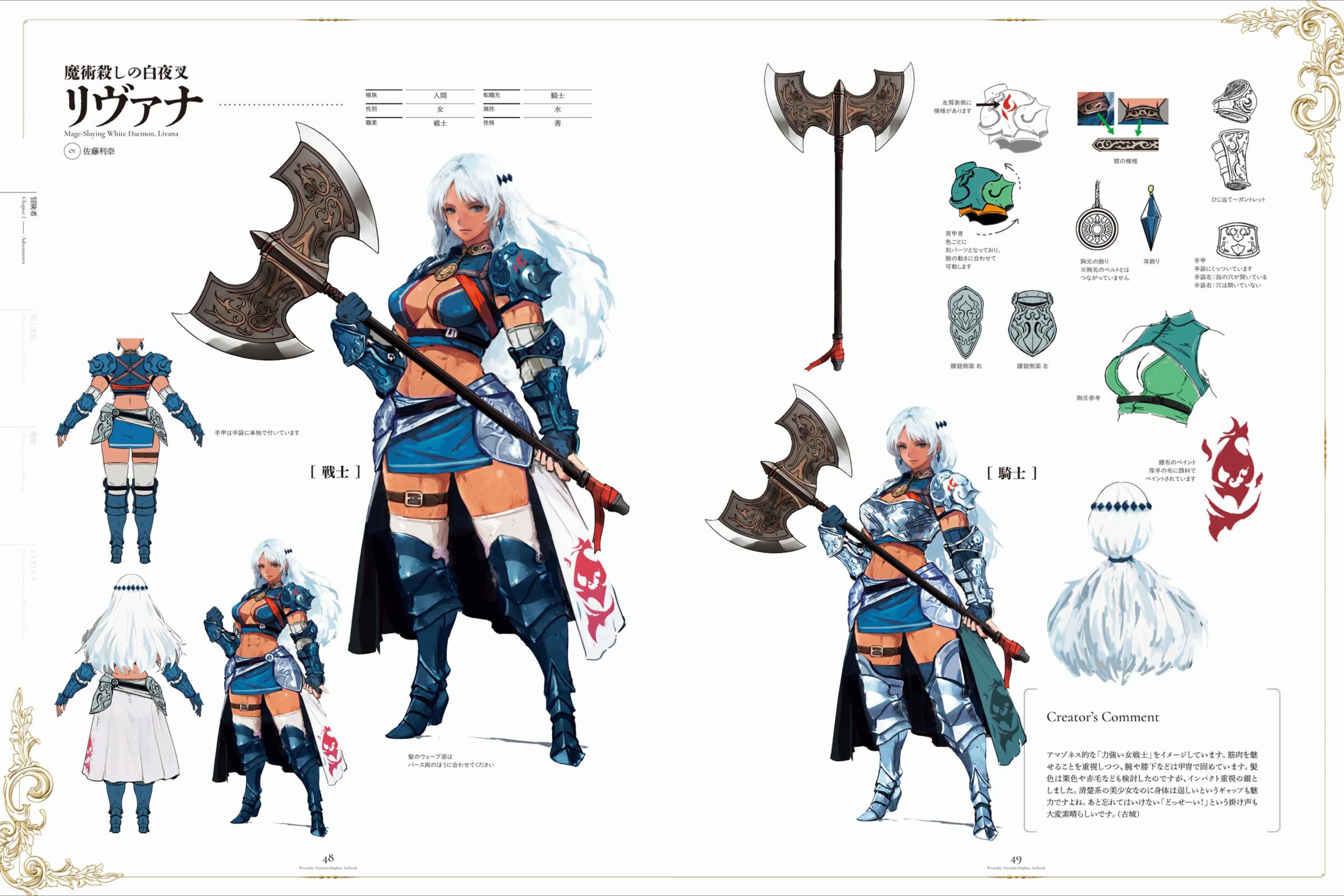 LivanaThe image is of a "strong female warrior" with an Amazonian feel. While we focused on showing off her muscles, her arms and lower legs are covered in armor. We considered chestnut or red hair, but decided on silver to emphasize impact. The contrast between her pure beauty and her robust body is also appealing. And let's not forget her call of "Dossei!", which is also wonderful.