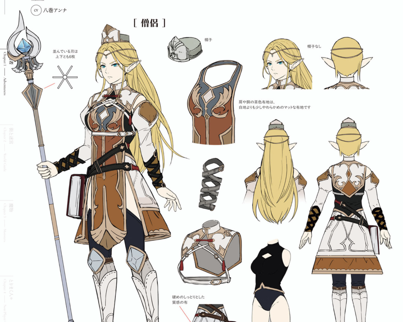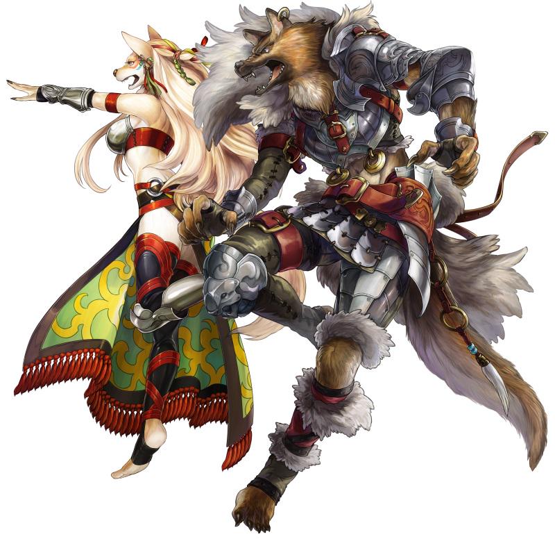 RaffaelloRaphael is a unique character who is half-dead, kept alive by alchemy and mechanical devices. His prosthetic left arm is the most noticeable, but his right arm is also skeletal, and his artificial ribs are visible on his chest. He is even worse looking than the masked adventurer. I guess they didn't want to make him a regular good-looking guy at the time... Please read "The Story of His Life" to find out why he ended up like that.YuzunamikiSince she's a beastman, there was also the idea of using a rabbit motif, but it still had a slightly spooky feel to it, so we decided to base the design on a fox. While Rinne is skilled in assassination techniques, Yuzunamiki is an image of someone who works as an espionage agent behind the scenes. However, she is also someone who is very strong when it comes to fighting. Her face is designed to look like she's friendly, given her role, but her true nature is probably cold-hearted... Her tendency to deceive and trick people is also what makes her fox-like.Yuzu could have been a rabbit girl instead. Also, bros she is just pretending to like us...>>553144831A Wolf Fighter, Ram Priest and Kobold Thief would be pretty cool.