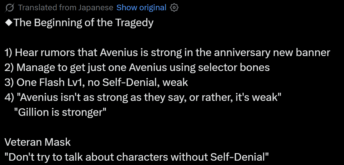 >>553319419The character will never outdo a character built strictly for any of these thingsYou gwos are indirectly seething about class changes giving characters too many options.But Class locked skills exist and the more the game progresses, the more class-locked skills will appear. >>553319506I agree WOTK is fucking retarded, but that's a game design issue on the level of alice inh. That's just the way the game is and will keep being because gacha is a cancer on games.