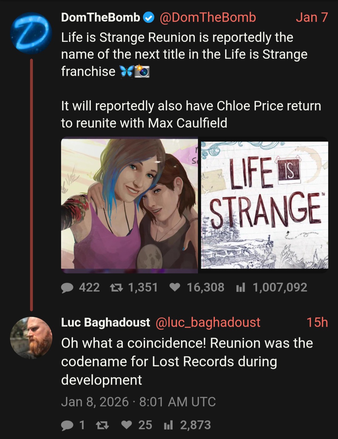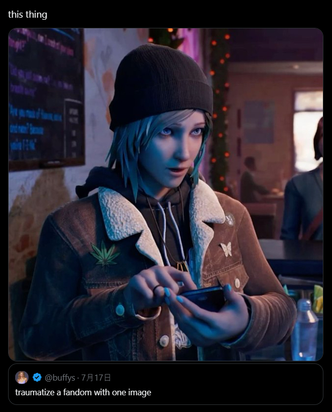 Soon to Be Reunited editionPrevious thread: >>552121687 >Life is Strange(LiS) - An episodic narrative adventure game by developer Don’t Nod (DN). Set in the fictional coastal town of Arcadia Bay, Oregon, it follows Max Caulfield, a shy, awkward photography student who discovers she can rewind time and—perhaps more urgently—that she’s very, very gay. At the heart of the story is Max’s reunion with her estranged best friend, the rebellious, blue-haired Chloe Price. Their bond becomes the game’s pulsing queer core as they unravel the mystery of Rachel Amber’s disappearance. What begins as a teenage reconnection blooms into a messy, tender queer odyssey about grief, desire, and the impossible choices we make for the people we can't truly live without.>Official Websites:https://lifeisstrange.com/https://dont-nod.com/en/>Life is Strange Series Steam:https://store.steampowered.com/curator/36149206>Lost Records Series Steam:https://store.steampowered.com/app/1902960>/lisg/ Permalink:http://orph.link/lisg>FAQs, Old Threads/Strawpolls, Soundtrack/Music & Leaks:http://orph.link/lisgarchive>/lisg/ Community Written Fan Fiction:http://orph.link/story>Compilation of Fanfics:http://orph.link/fanfic>/lisg/ Content Producers:http://imgur.com/a/DOAKn>Art of LiS:https://www.youtube.com/watch?v=265yHETXRXo [Embed]>/lis/ sings:https://www.mediafire.com/file/1y584yhvq5p2y35/Glass+walls+lisg+edition.mp3https://web.archive.org/web/20200324102651/https://www.youtube.com/watch?v=WjPsOkijFh0https://www.youtube.com/watch?v=2aSC1kY30uI [Embed] (dead link)Discussion of other LiS games in the series like Life is Strange 2, TC, Don't Nod's other media like Lost Records, the upcoming TV show and other similar games is welcome!
