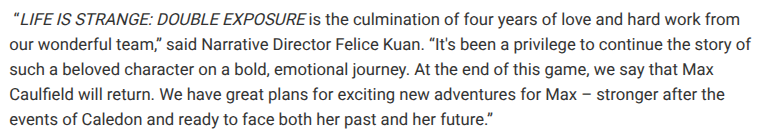 >>553288826That's why I said it may not be explicitly a lie. There may be some truth to what she was saying/predicting. 'Chloe's appearance, if it happens at all, will be reactive, directionless, and unplanned for by DE1.'She hints there's a possibility Chloe may not appear at all. Seems she will appear after all if the PEGI listing is accurate.She says any inclusion will be reactive. And that may genuinely be true. But if Chloe's inclusion is significant to the story that implies the 'reaction' happened earlier than just at the very last minute. e.g that whole Rhianna DeVries website posting about a 'lead role' might line up with the plans for Reunion. People spotted that a very long time ago.She says her role will be directionless. Which may also be true. But the tag-line hints at a chosen story direction. A Chloe with 'impossible memories'. Ties to the above point. How long did they spend on writing this new direction? Did they spend enough time to come up with something compelling rather than directionless?She says it was unplanned for by DE1. Also possible. But recall the press release for DE1 where Kuan was already saying that Max will exit the game 'ready to face her past and her future'. That sounds like a plan was already being pulled into place. So while I don't know that Devheart is a liar, I would say she's given the most cynical/pessimistic interpretation possible. Maybe her pessimism will come true. But recognizing bias is a thing.