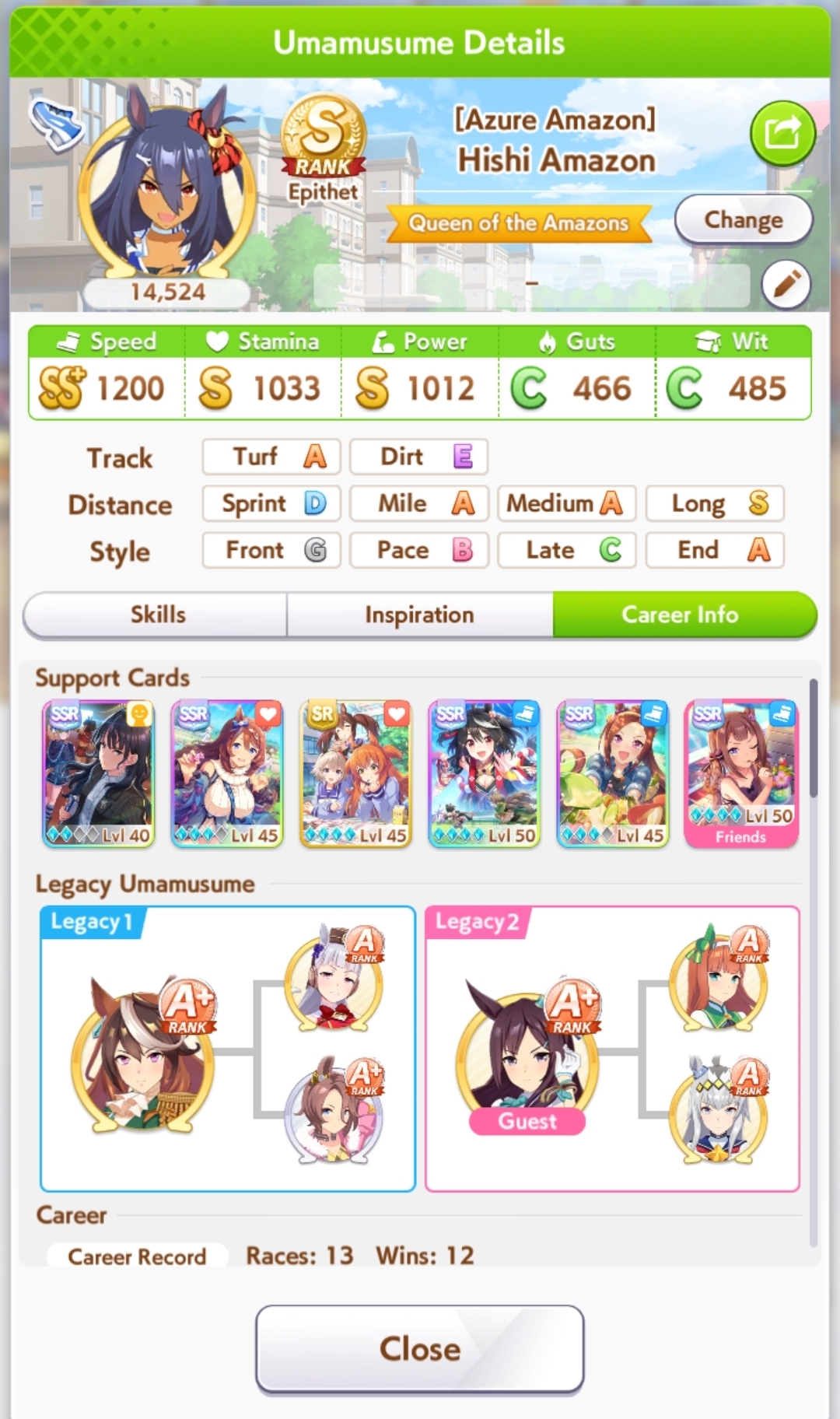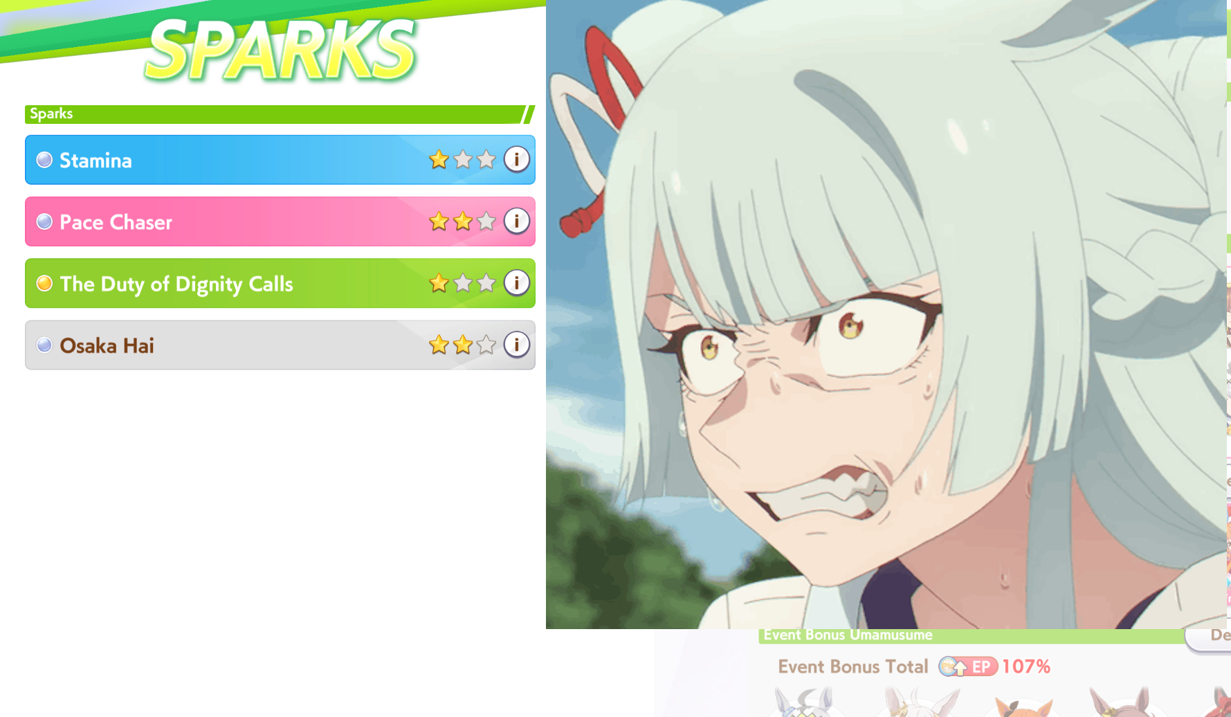 Anyone trying to Gutsmax CM8? Seems to require some serious highrolling.Been trying with this deck on Daiwa for her guts/spd bonus.Fujin for speed bonus, bijin for pow bonus. Also tried dropping Riko for another Guts card (Doto)I've also tried a half speed half wit deck with Seiun/Bourbon/FineMo on Wit, Fujin, Air Groove and Urara on Guts. Doesn't seem to be working well but maybe it just needs to hit.