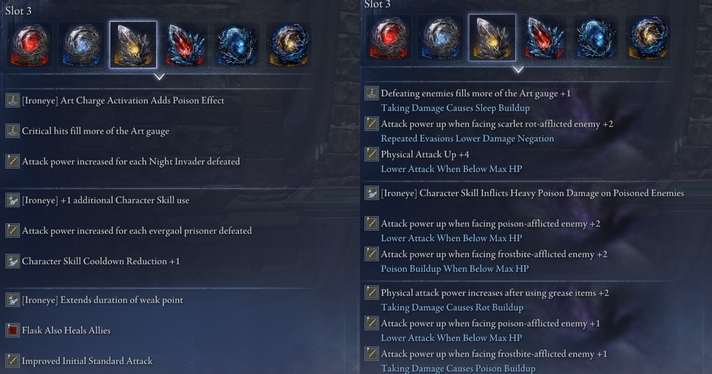 >>553235313Gives you +3 poise. Higher poise makes you flinch from attacks less. There are breakpoints so +3 poise might not effect the breakpoint on some characters. Its not a great stat, the characters that want the extra poise get virtual poise for doing things anyway. Turning yourself into a lead weight might make skill spamming more consistent but thats advice for someone getting hit constantly while spamming skills those types need more help than just that.>>553235530Doesn't really happen to me. I get why people complain about things I'm just not that type of person. I'm self actualized so if I'm struggling with something I take the time to learn how to fix it instead of crying and coping to feel better. The issues I had with this game's combat was solved for min last game's combat and the near 5000 hours I put into playing it.