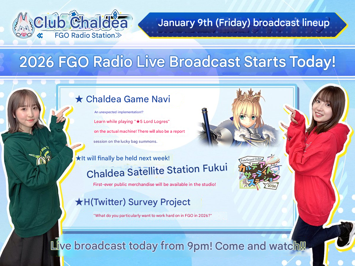 Previous: >>553118917>"The Beginning of Aftertime":●Release date: January 7 JST.▶Costume dress for U-Olga Marie available at Dress Making Shop after clearing.https://news.fate-go.jp/2026/01/after_time/>Fate/strange Fake Broadcast Commemoration Campaign:●January 3~10 JST.▶Login Bonus: A commemorative CE.▶Interludes for Gilgamesh and Enkidu will be open for all players.https://news.fate-go.jp/2026/2026_f_s_f_cp/>Fate/strange Fake PU summon:●January 3~10 JST.5*Saber Richard I (limited)●January 9~16 JST.5*Archer Gilgamesh (limited)5*Lancer Enkidu (permanent)https://news.fate-go.jp/2026/2026_f_s_f_cp_pu/>2026 New Year's Campaign:●January 1~15 JST.▶Present: 30 SQ, 20.26M QP and a commemorative CE.▶Login Bonus: 30 Hellfire of wisdom, 10M QP, 1 Crystallized Lore, 20 3*Fou-kun (10ATK, 10HP),10 Golden Apple, 1 Beast's Footprint, 2 5*Fou-kun (1ATK, 1HP) and 1 Holy Grail.▶Panel Missions: 5 Summon Tickets, 1 Crystallized Lore, 4.42M QP, 6 SQ, 7 Grail Tears,1 Beast's Footprint, 3 Golden Apples, a limited 3*Command Code and a commemorative CE.▶A Stargazer's Teapot will be added to daily missions rewards (~Jan 7).▶Master level increased to 200.▶The chances of obtaining a great/super success when strengthening a servant/CE will be double.▶AP consumption for Ember Gathering and Training Grounds will be halved.https://news.fate-go.jp/2026/newyear2026_cp/>2026 New Year PU summon:●January 1~14 JST.5*Saber Lord Logres●January 7~9 JST.5*Assassin Huyan Zhuo4*Avenger Xu fu●January 8~10 JST.5*Rider Takeda Shingen4*Berserker Nagakura Shinpachi●January 9~11 JST.5*Ruler Mélusine4*Archer UDK-BarghestAll limitedhttps://news.fate-go.jp/2026/newyear2026_pu/>/fgog/ Friendlist form and spreadsheet (2026):https://forms.gle/WK4dwSC6Mn2WQfZu8https://docs.google.com/spreadsheets/d/1leQ09m5klFajbCcededkANJfeMiAmVz-PbCI_r7xyXc/edit?usp=sharing>Utility links:https://pastebin.com/iaWmXAq7